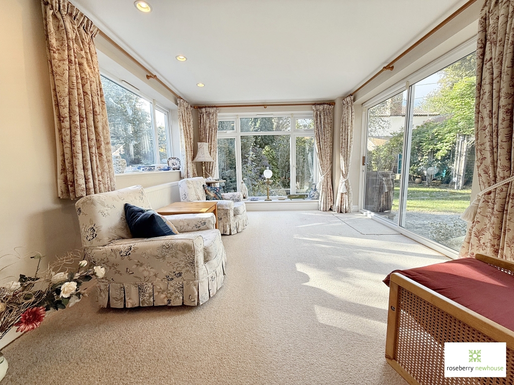 A welcoming porch and hall introduce the ground floor, where traditional reception space unfolds with ease. The elegant living room, anchored by a fireplace, opens into a bright garden room with wide views of the lawns. A generous dining room—also with a fireplace—sets the tone for relaxed entertaining, while the open-plan kitchen/breakfast room offers ample cabinetry and worktop space, supported by a separate utility and a guest cloakroom.