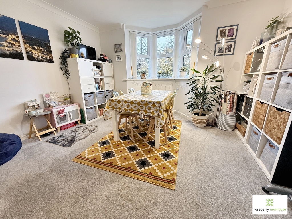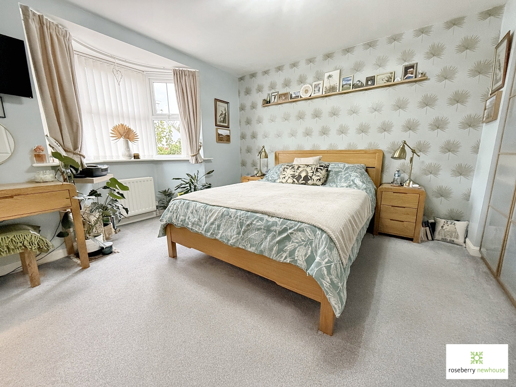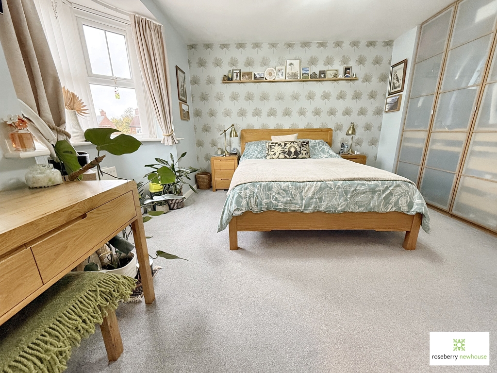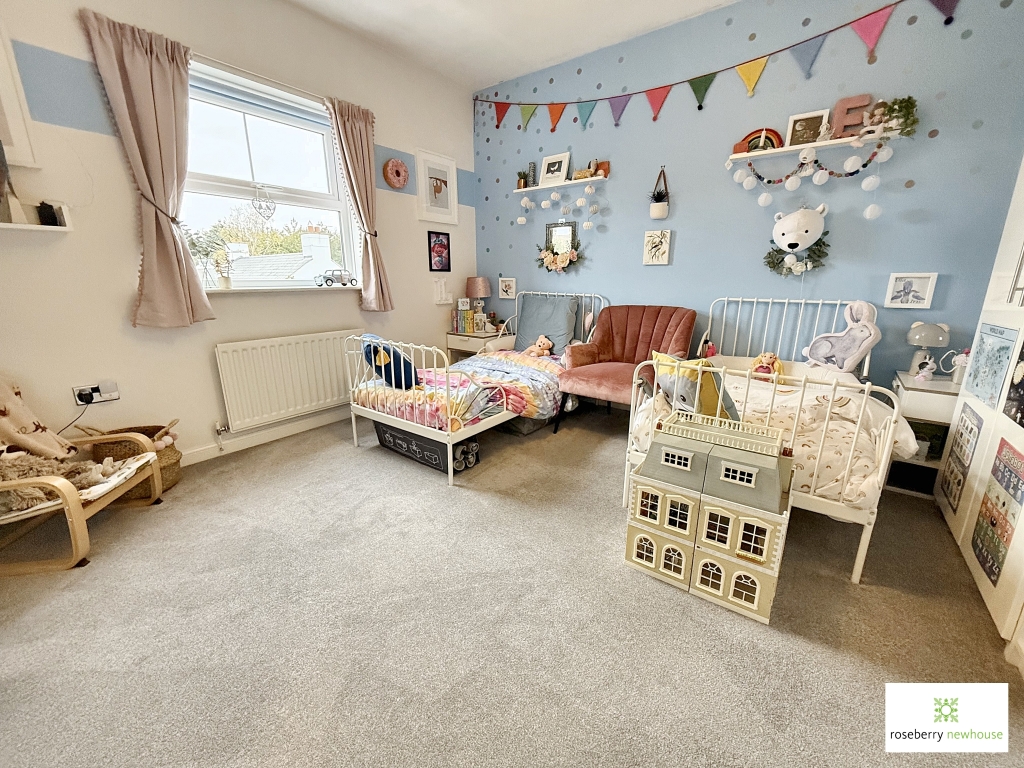 The first floor combines versatility with comfort, hosting a bay-fronted living room centred on an elegant fireplace—ideal as a second lounge, cinema space or large home office—together with a principal bedroom featuring fitted storage and a stylish en-suite bathroom. The top floor accommodates three further bedrooms arranged around a well-appointed Jack-and-Jill bathroom, creating an excellent layout for children, guests or flexible workspaces.
