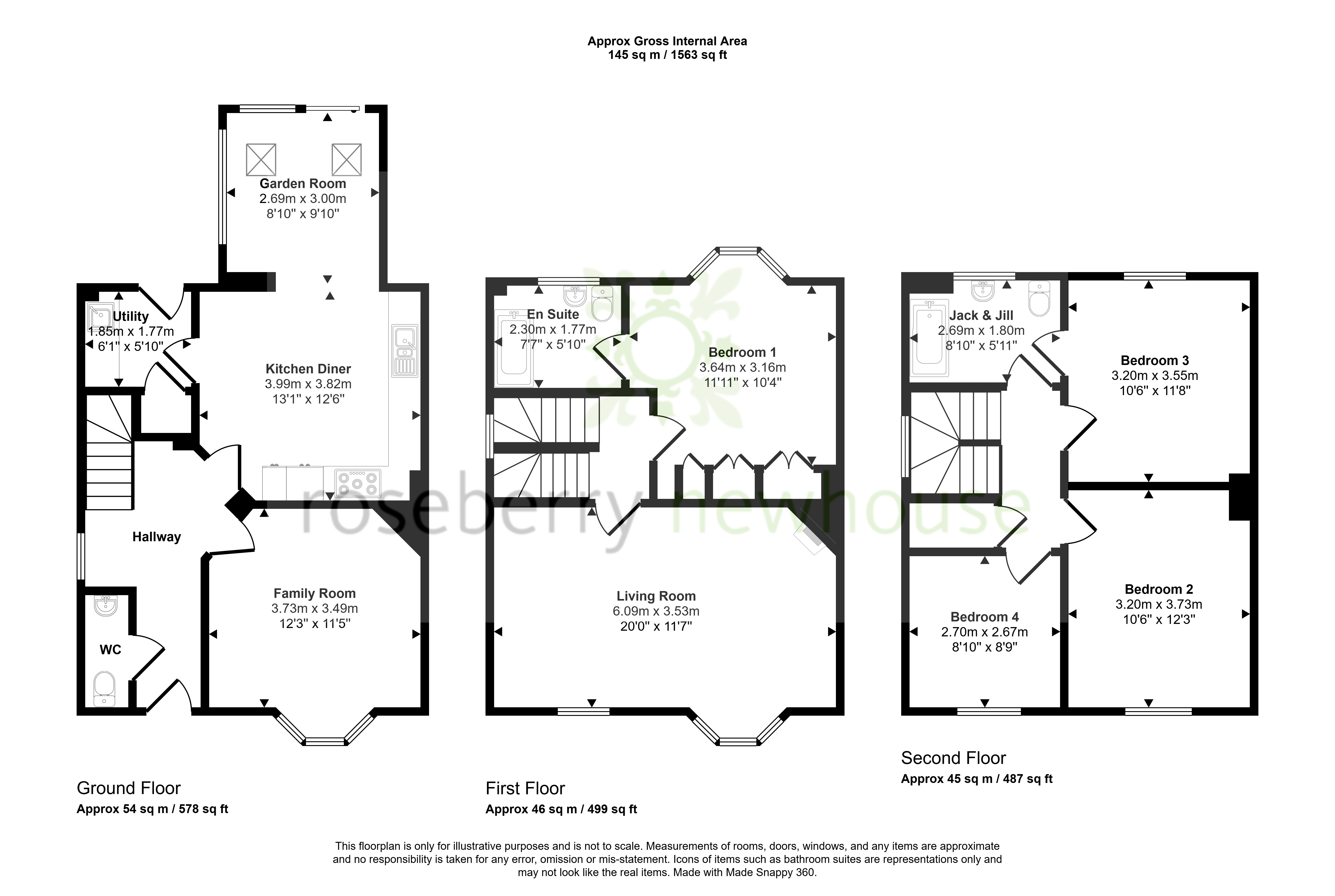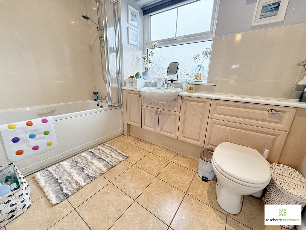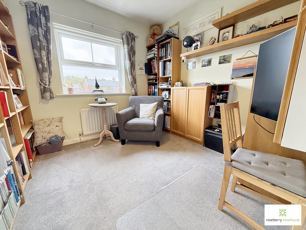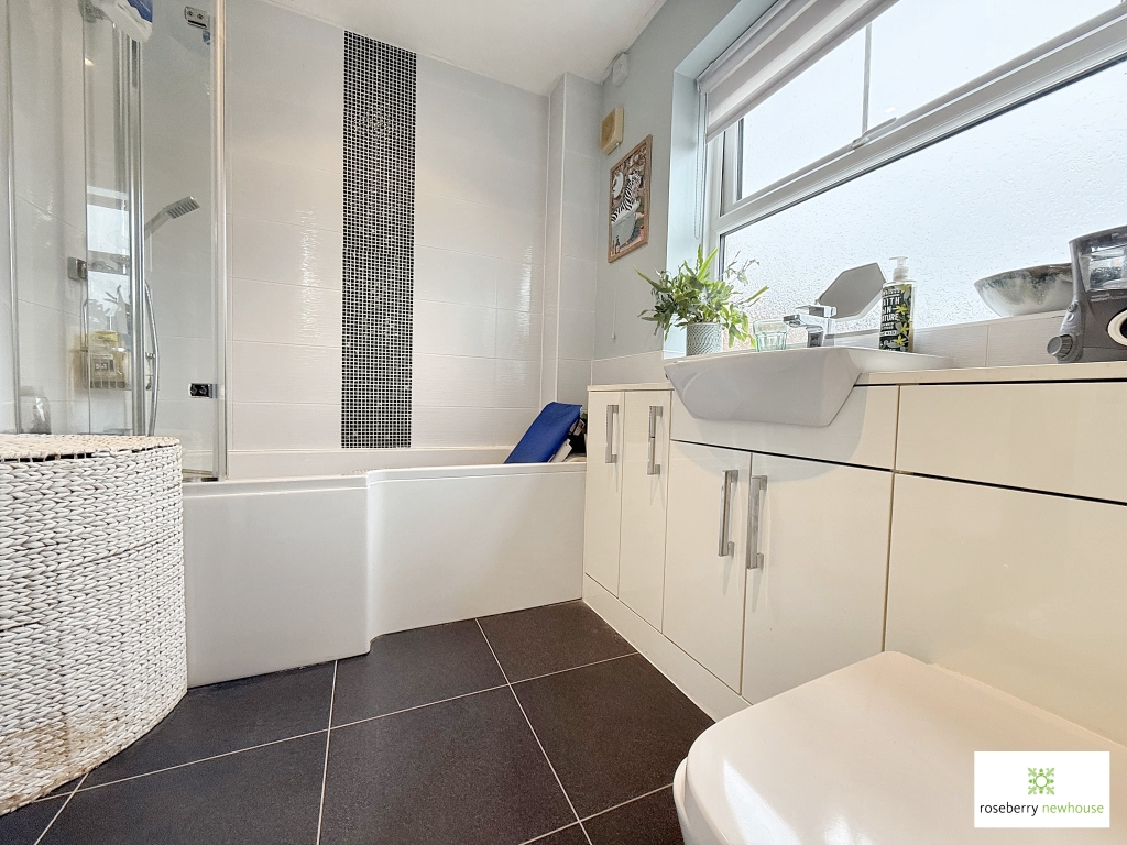 The first floor combines versatility with comfort, hosting a bay-fronted living room centred on an elegant fireplace—ideal as a second lounge, cinema space or large home office—together with a principal bedroom featuring fitted storage and a stylish en-suite bathroom. The top floor accommodates three further bedrooms arranged around a well-appointed Jack-and-Jill bathroom, creating an excellent layout for children, guests or flexible workspaces.