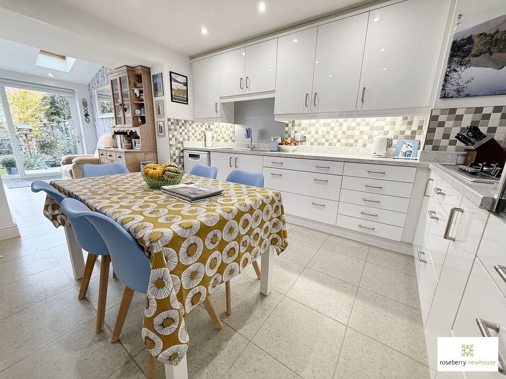 The entrance hall introduces a calm, neutral palette and serves a useful cloakroom. To the front, a comfortable sitting room provides an inviting retreat, while the rear of the house opens out into the hub of the home: a sleek, contemporary kitchen with integrated appliances and ample storage, flowing into a light garden room with skylights and wide doors onto the terrace—perfect for everyday dining and effortless entertaining. A separate utility room keeps the practicalities neatly out of sight.