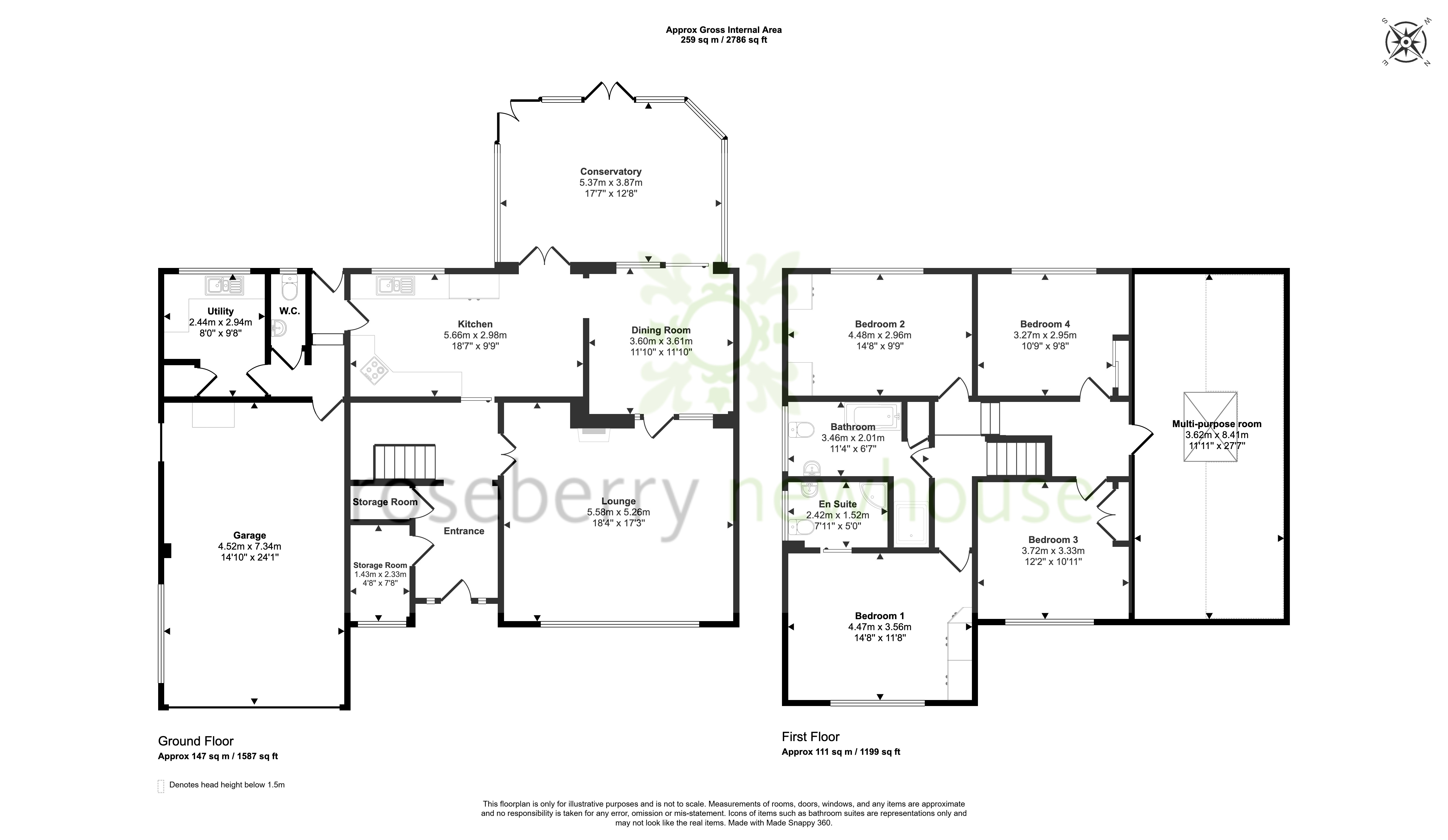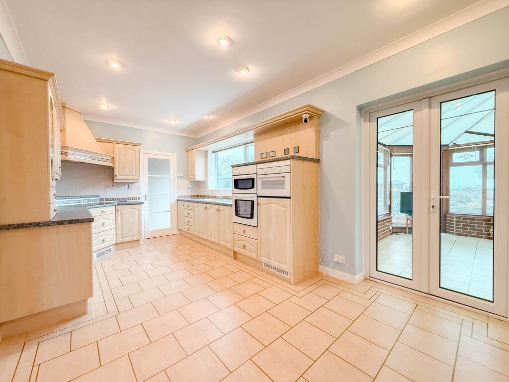 The ground floor is centred around a welcoming entrance hall leading through to a large principal lounge, a superbly sized space flooded with natural light and ideal for both relaxed family living and entertaining. A separate dining room connects seamlessly with the kitchen, while the adjoining conservatory provides a wonderful vantage point from which to enjoy the garden and countryside beyond throughout the seasons. The kitchen itself is well sized, supported by a utility room and ground floor WC, adding practicality to everyday life. Additional storage rooms and internal access to the garage complete the ground floor footprint.