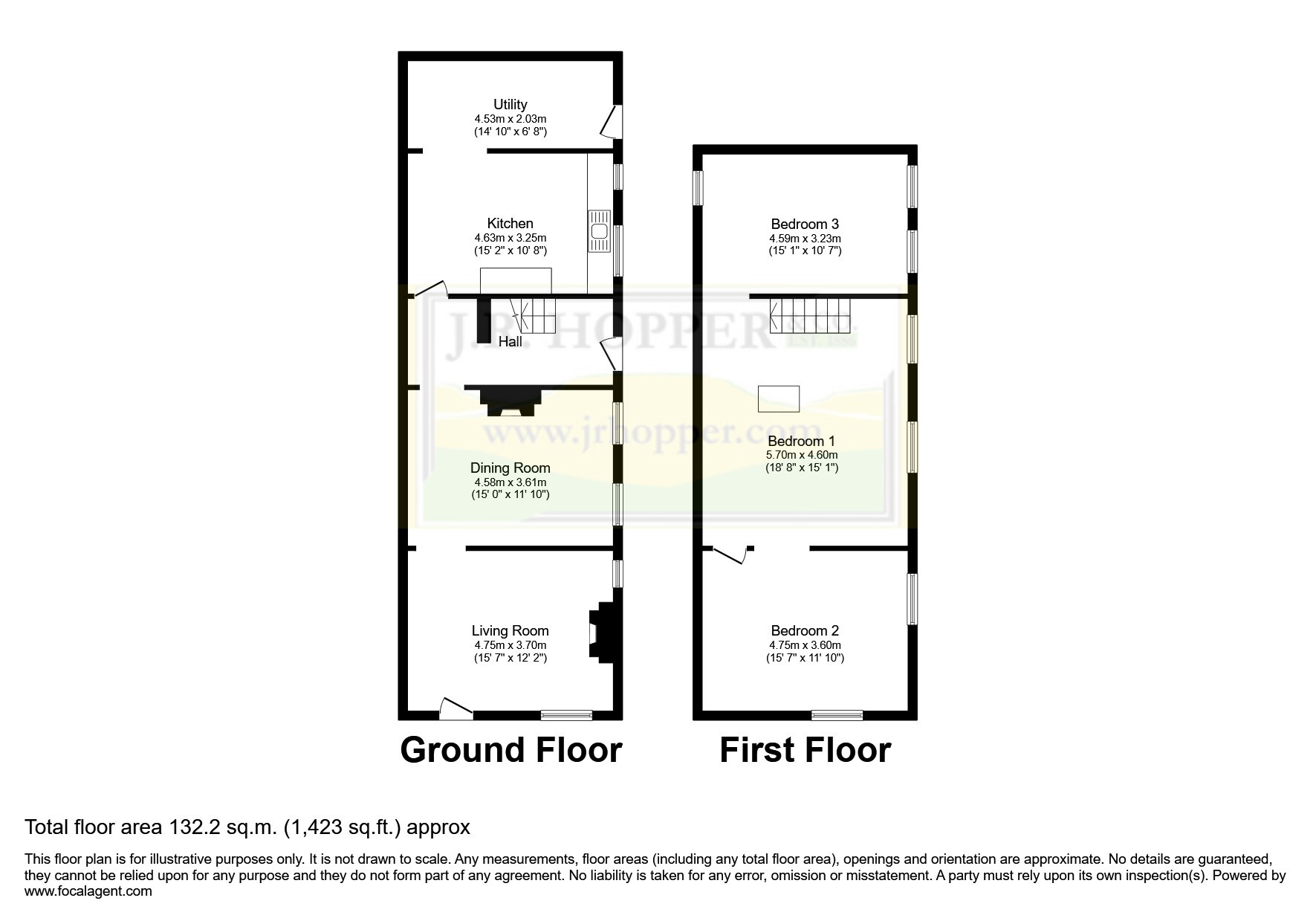 The property presents fantastic scope and currently to the ground floor you enter via an entrance hallway which leads to a living room with an open fireplace, a dining room also with an open fire, a kitchen, and a separate utility room. On the first floor, there are three generously sized double bedrooms and space available to install a family bathroom.