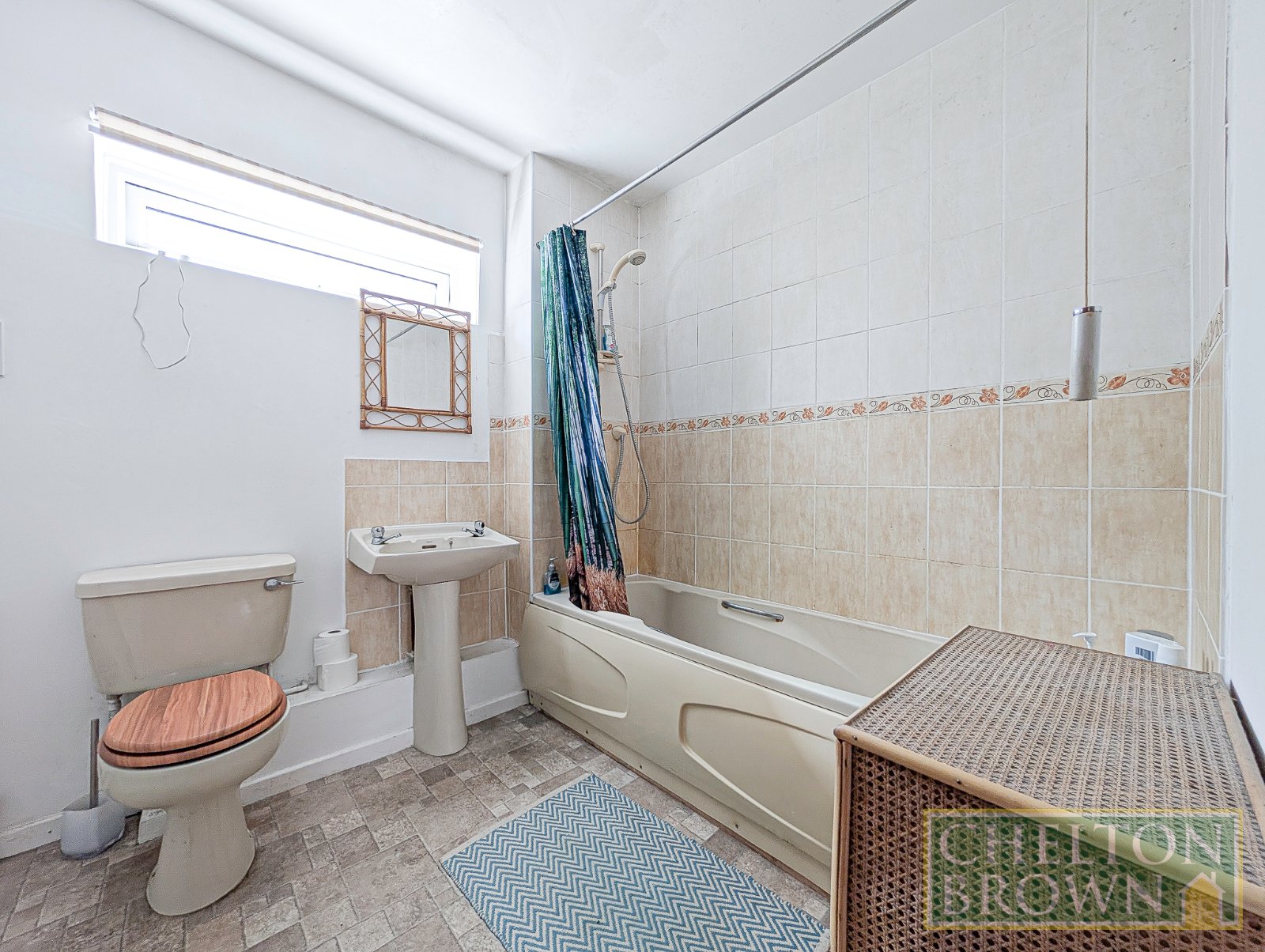 The primary bedroom is a substantial double room, offering flexibility in layout and easily accommodating a wide range of furniture. The second bedroom is another well-proportioned room, perfectly suited as a guest bedroom, home office, or hobby space. The family bathroom is larger than average, complete with a shower over bath and a useful built-in storage cupboard.