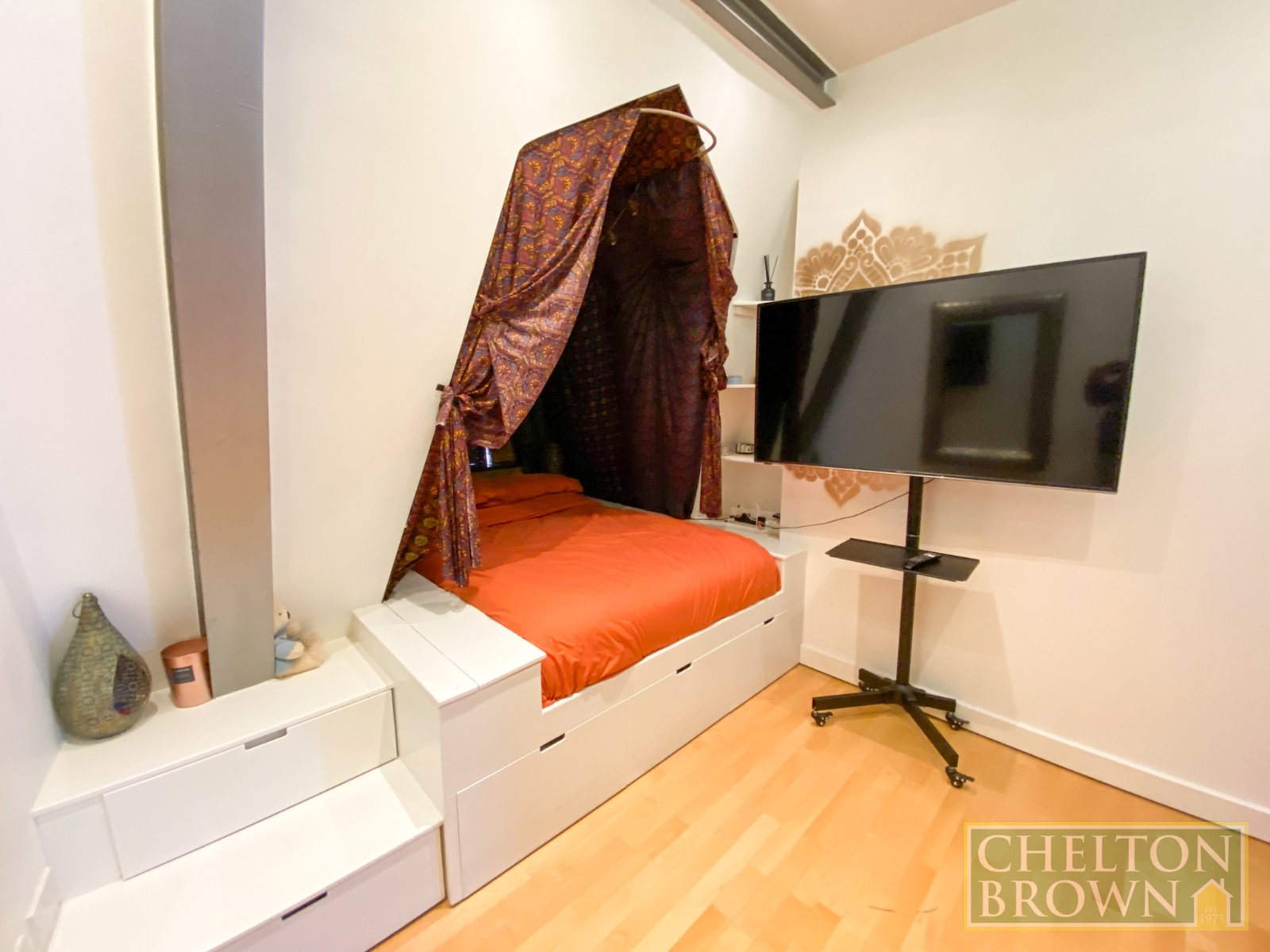 Bedroom Two 16'11" x 9'2" (5.16m x 2.8m). Beech laminate floor, exposed stanchions and brickwork, there are further built-in wardrobes with shelving and hanging space and bespoke built-in double bed with storage.