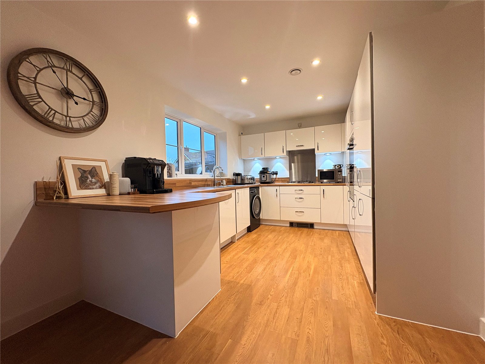 Kitchen Dining Family Room 26'2" x 9'6" (7.98m x 2.9m). A vast multipurpose room with the kitchen area laid out to one end fitted with a range of white high gloss fronted soft closing eye and base level units with wood effect rolled edge work surfaces and upstands over. The base units include a wide pan-drawer stack and integrated dishwasher and offer space and plumbing for a washing machine, integrated fridge and freezer, integrated eye level Bosch double oven and Bosch gas hob with concealed extractor fan over and stainless steel splash back. Inset one and a half bowl stainless steel single drainer sink unit with swan neck mixer tap over, Upvc double glazed window to rear aspect, inset spotlights, breakfast bar dividing the areas and continuation of Amtico flooring which also continues to the dining/family area with single panel radiator and Upvc double glazed double opening French style doors with full length Upvc double glazed windows to either side, opening onto the patio of the rear garden.
