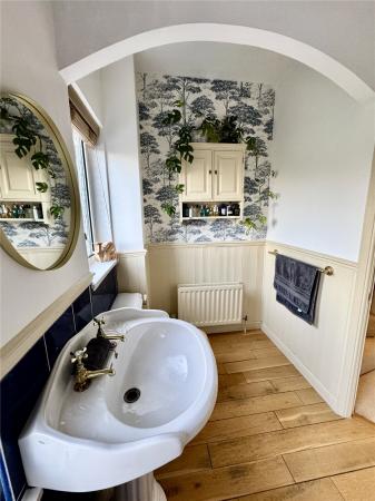 Bathroom 10'6" x 6'6" (3.2m x 1.98m). Fitted with a white three piece suite comprising of a low level WC, pedestal wash hand basin, panel bath with antique style mixer tap and shower attachment with plumbed in antique style shower, tiling to water sensitive areas, exposed wooden flooring, recessed spotlights, radiator, two opaque Upvc double glazed windows to rear aspect