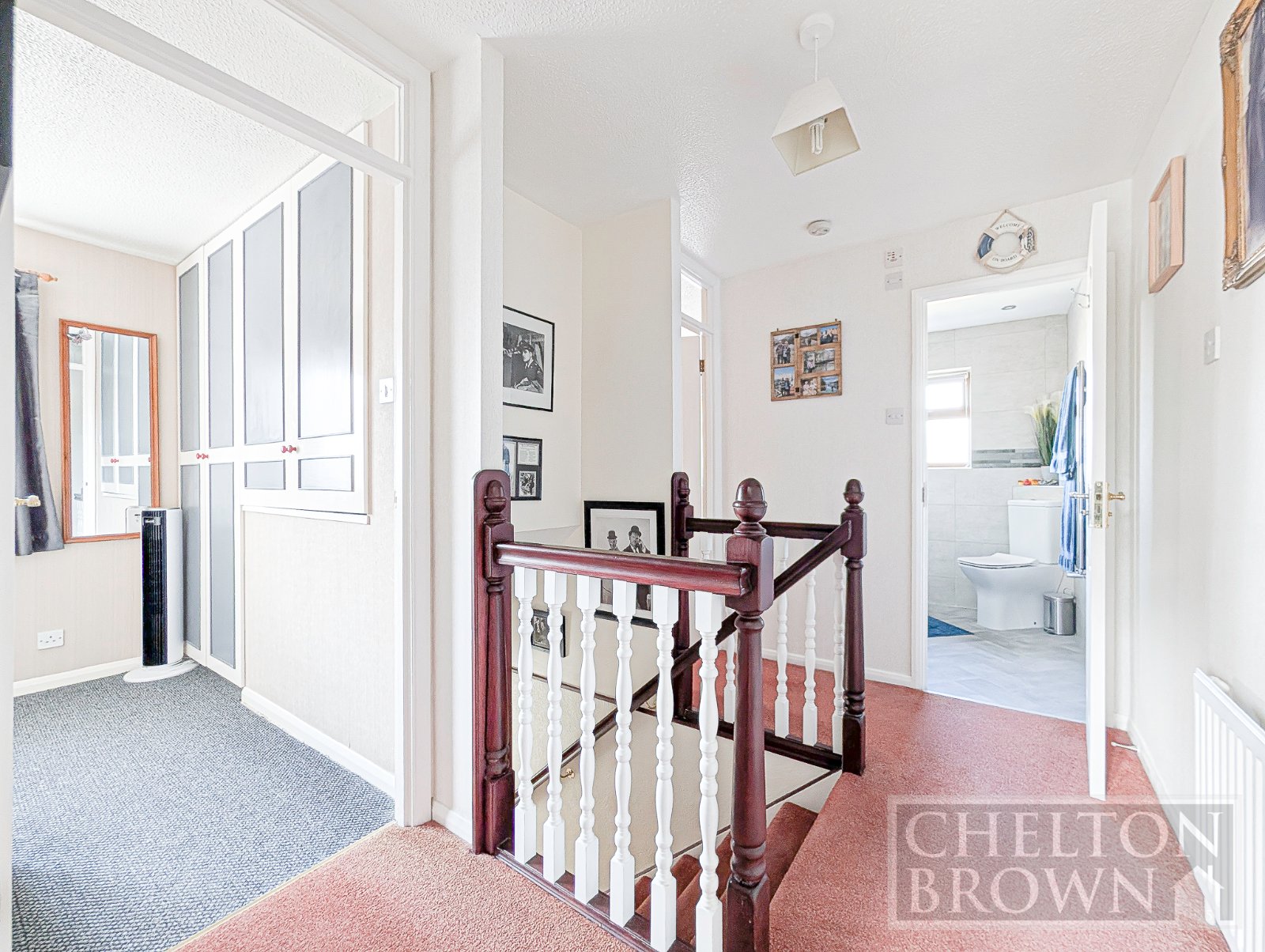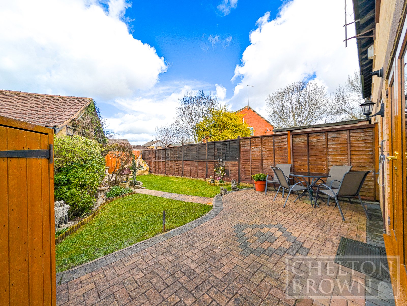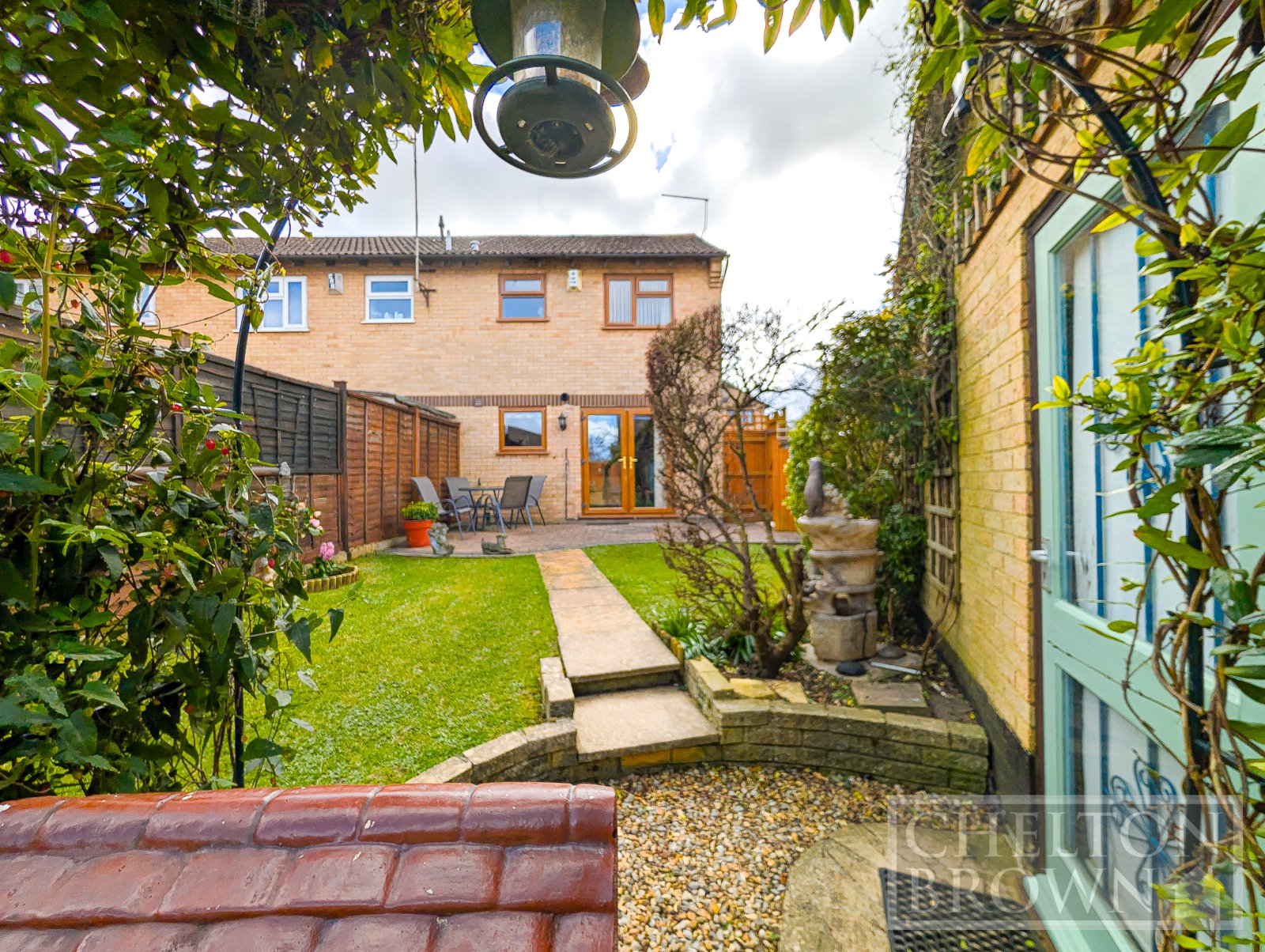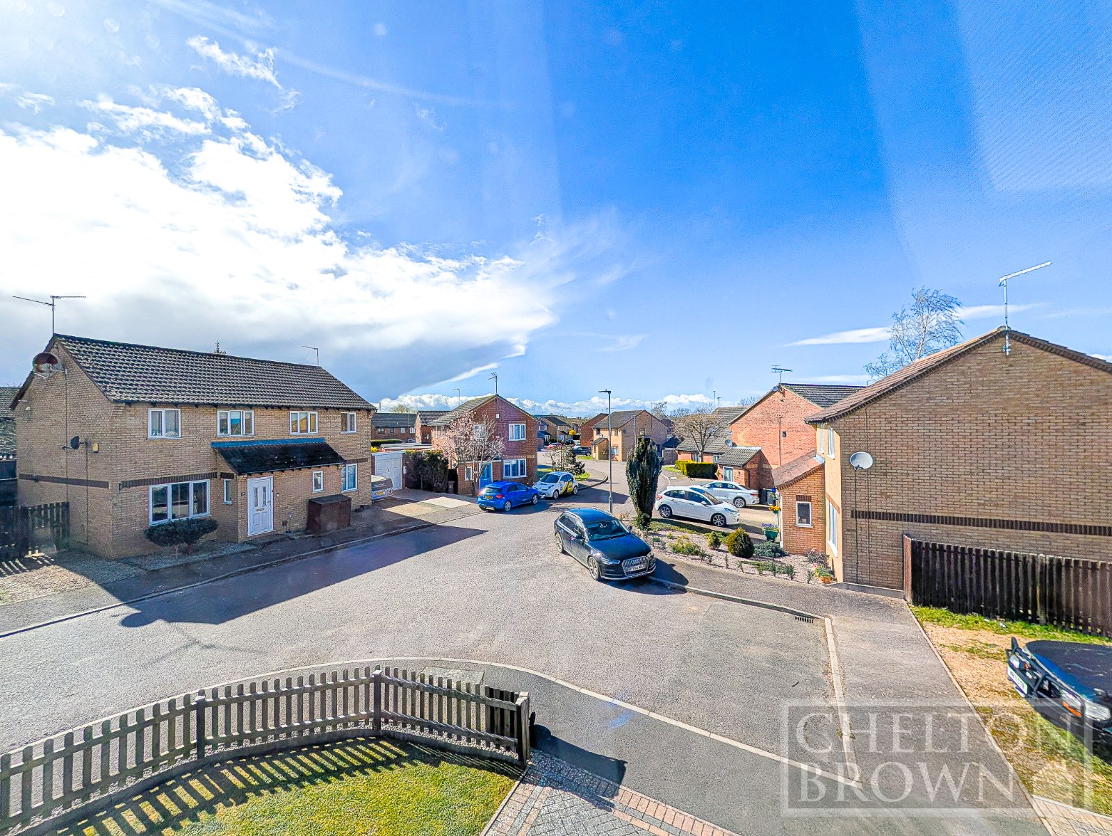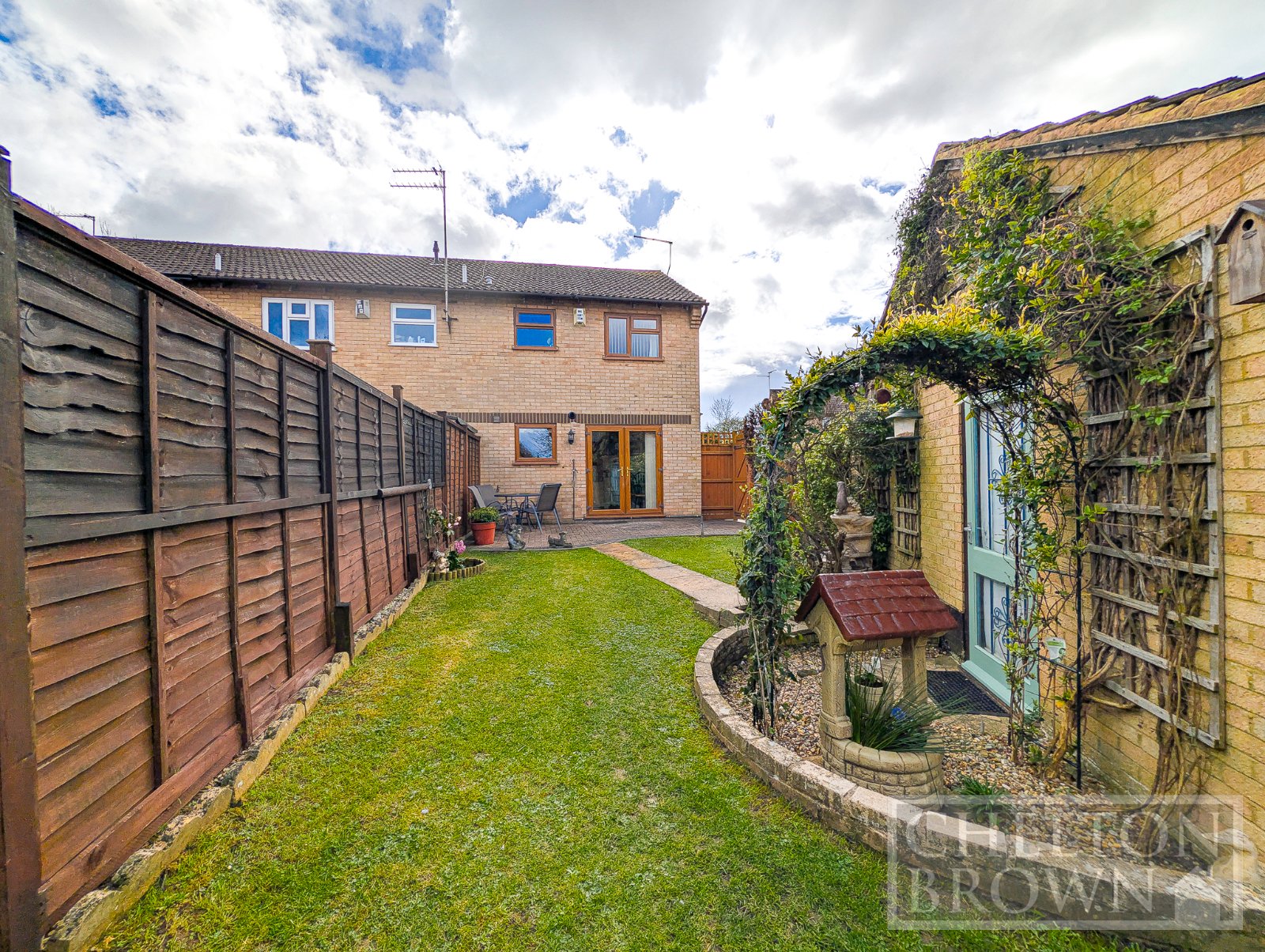 Upstairs, a roomy landing gives access to all three bedrooms and the beautifully updated family bathroom. The primary bedroom features extensive built-in wardrobes and enjoys garden views. Bedrooms two and three are both tastefully decorated, offering lovely outlooks over the park and the peaceful cul-de-sac; bedroom three also benefits from excellent builtin storage.