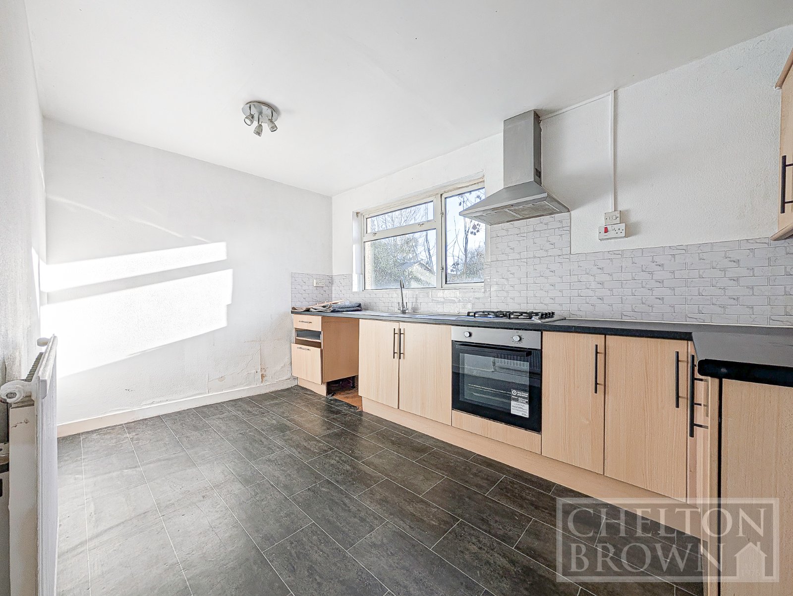 The living room is a bright and spacious reception area, enhanced by a large window that floods the space with natural light. The original chimney breastcurrently closedpresents a wonderful opportunity to reinstate a working fireplace or install a cosy log burner, instantly adding charm and warmth to the room.
