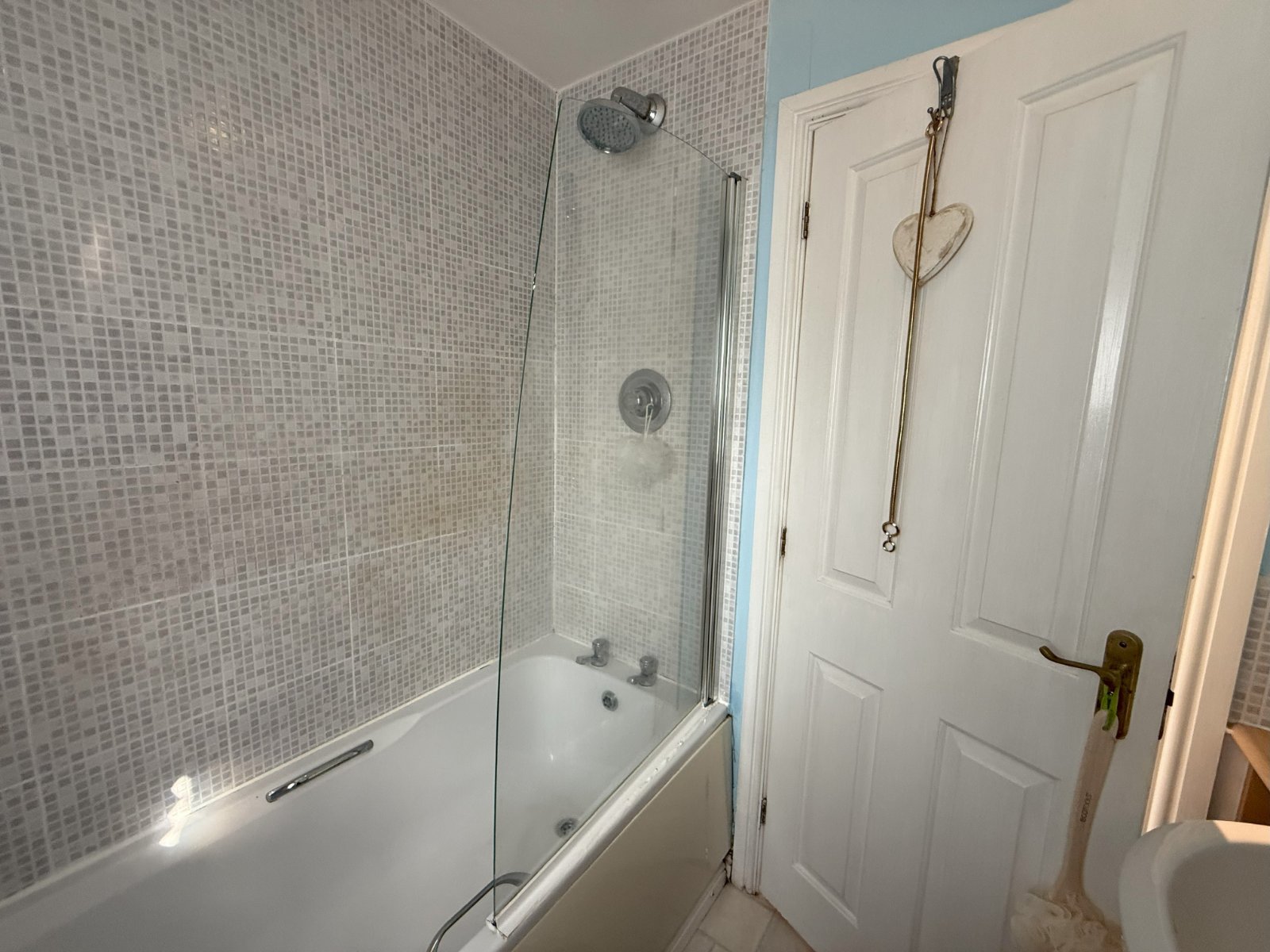 The bathroom has a white three piece suite with shower over bath and vanity unit.
