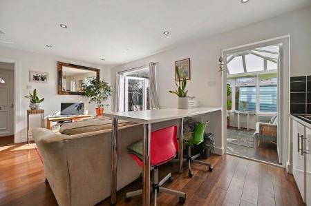 The property offers bright and well-appointed accommodation throughout. On the ground floor, an entrance porch leads into an attractive open-plan living space. The lounge area is light and welcoming with patio doors to the garden, with stairs rising to the first floor, and flows seamlessly into a modern fitted kitchen featuring sleek units and integrated cooking appliances. There is a conservatory with bi-folding doors into the private garden, creating an ideal space for relaxing or entertaining. The ground floor is finished with stylish wood flooring, adding to the modern feel of the home.