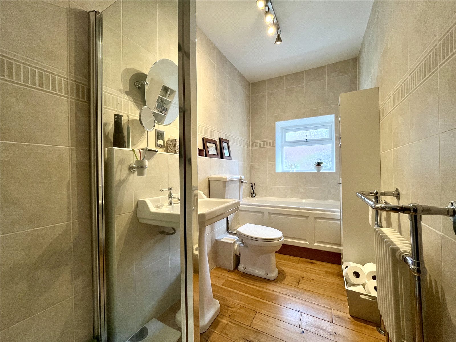 Panelled bath with shower attachment, separate shower cubicle, pedestal wash hand basin, low level WC, fully tiled walls. Deal flooring, shover point and heated towel rail.