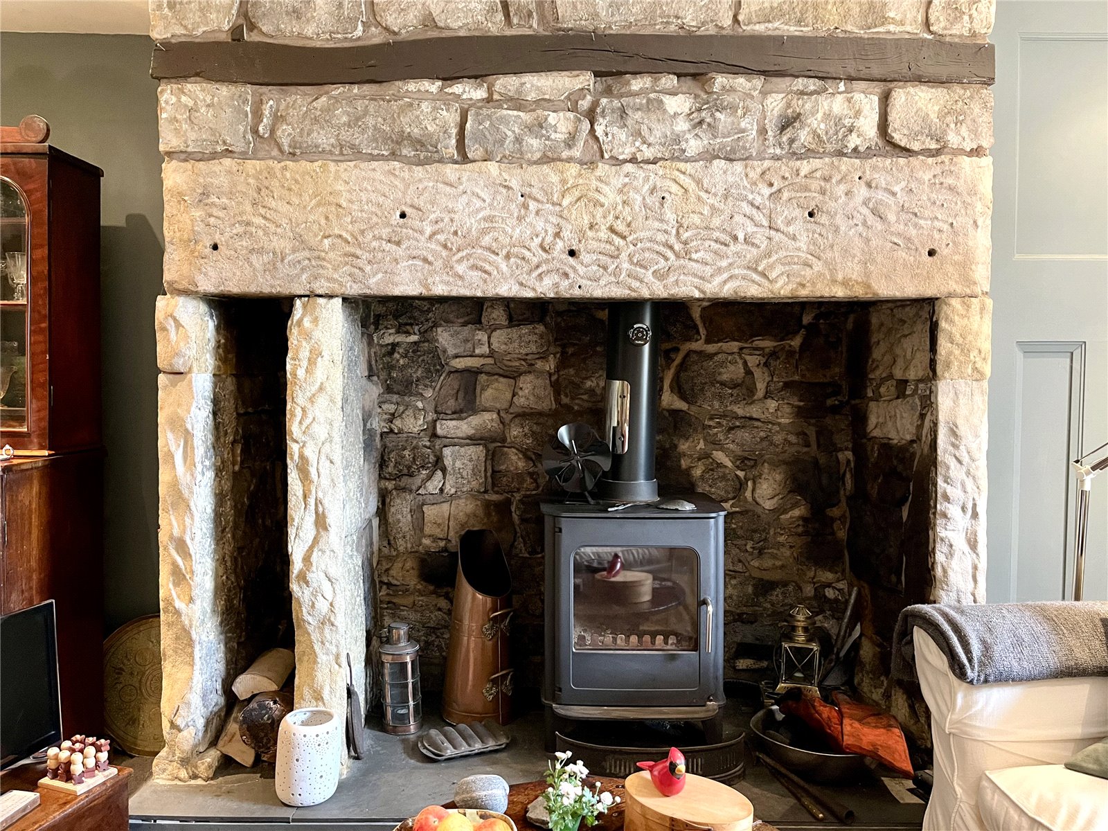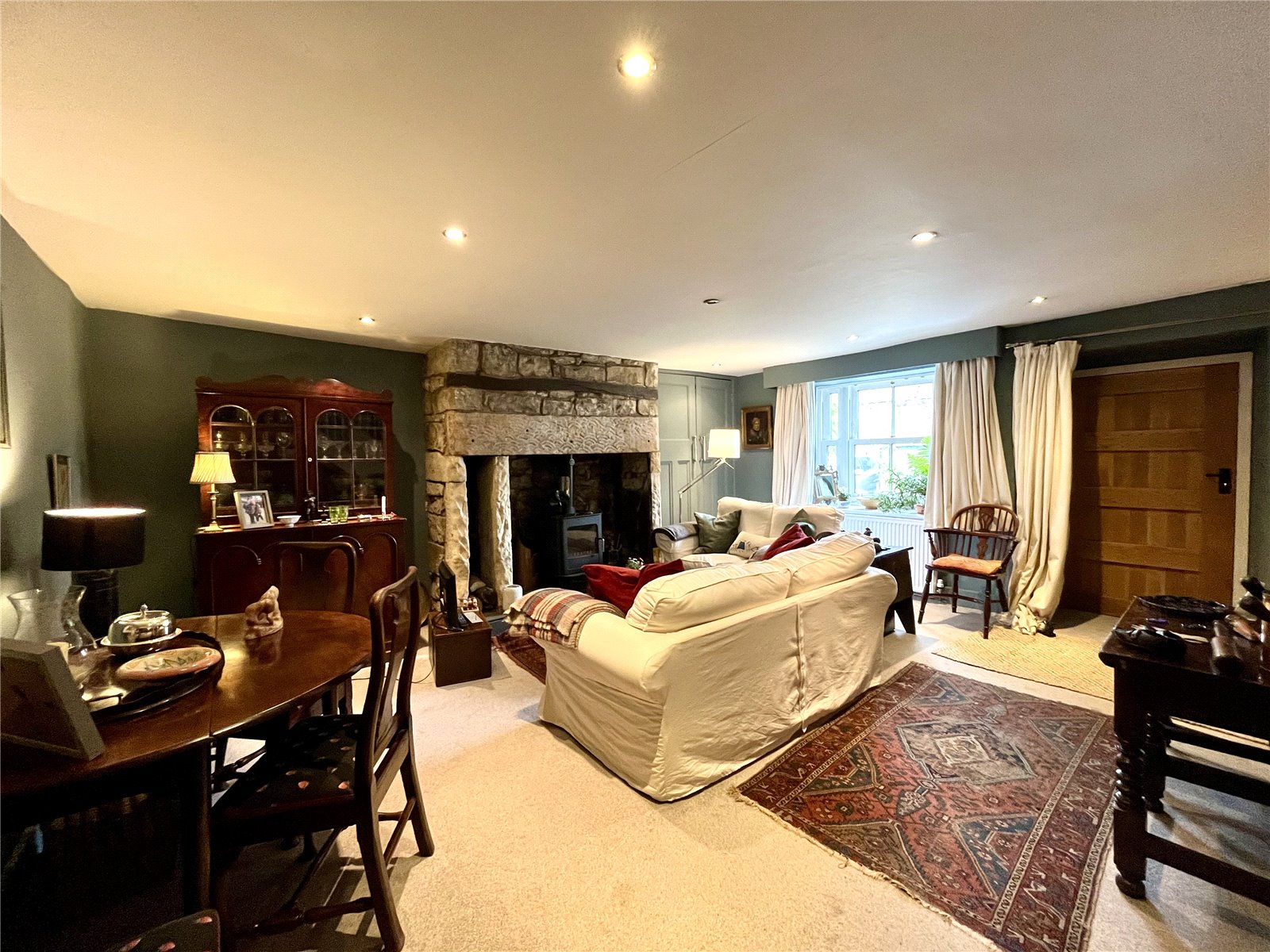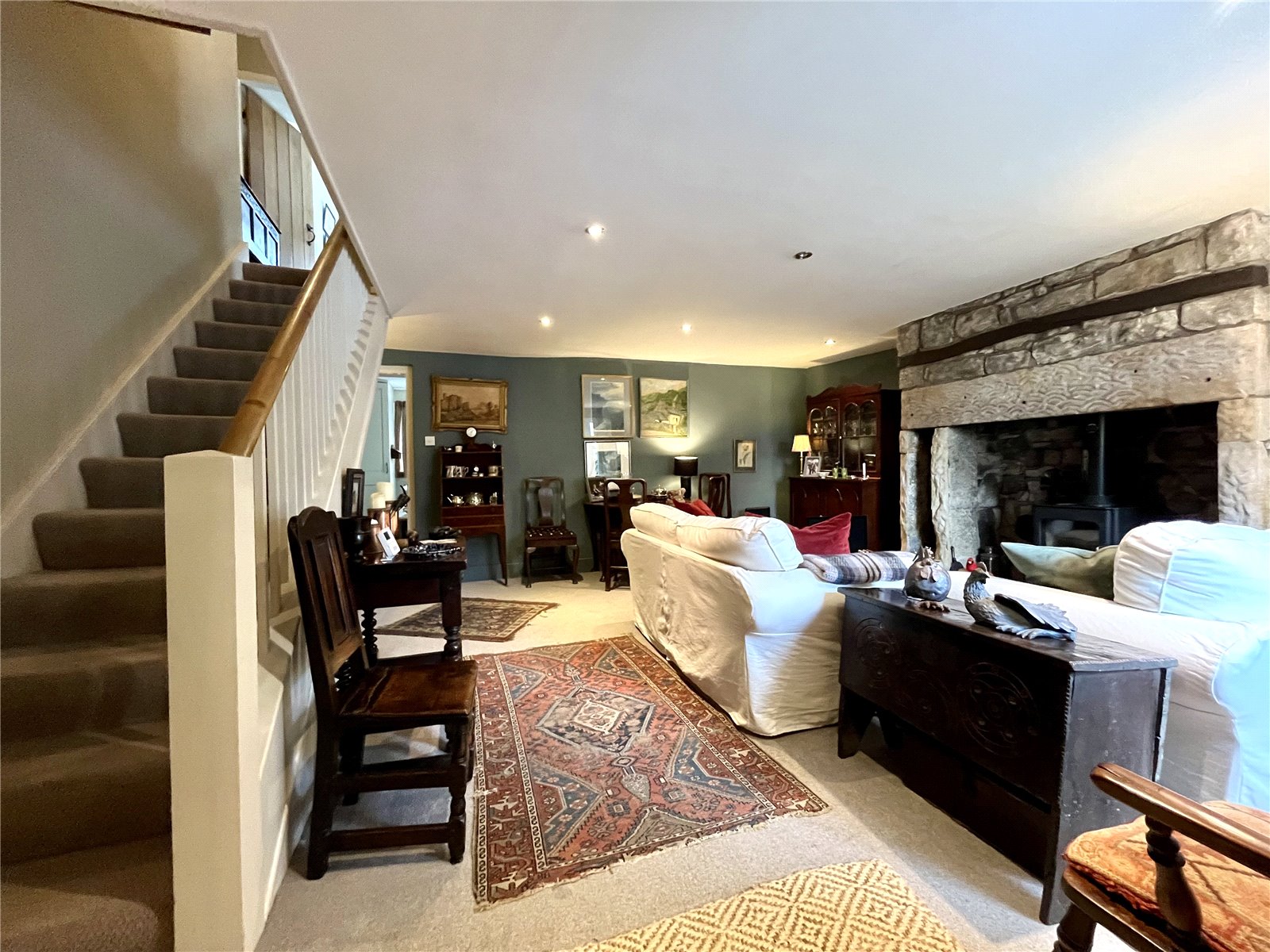 (maximum measurement overall) The focal point is the superb dressed stone Inglenook fireplace incorporating a multi-fuel burning stove on a raised hearth and unique log storage to one side and large built-in cupboards to one corner. (There is Deal flooring underneath the carpet). Staircase to first floor.