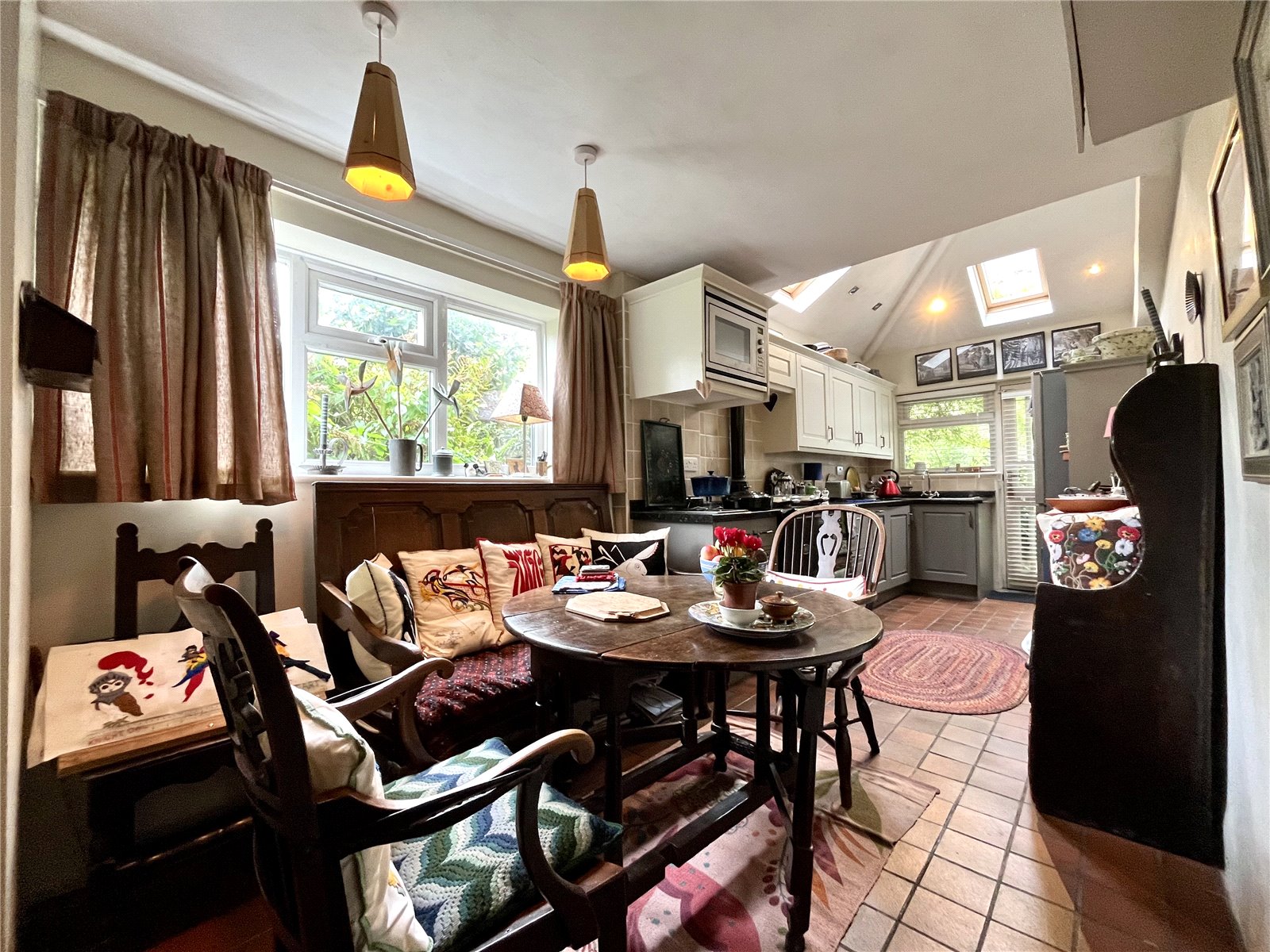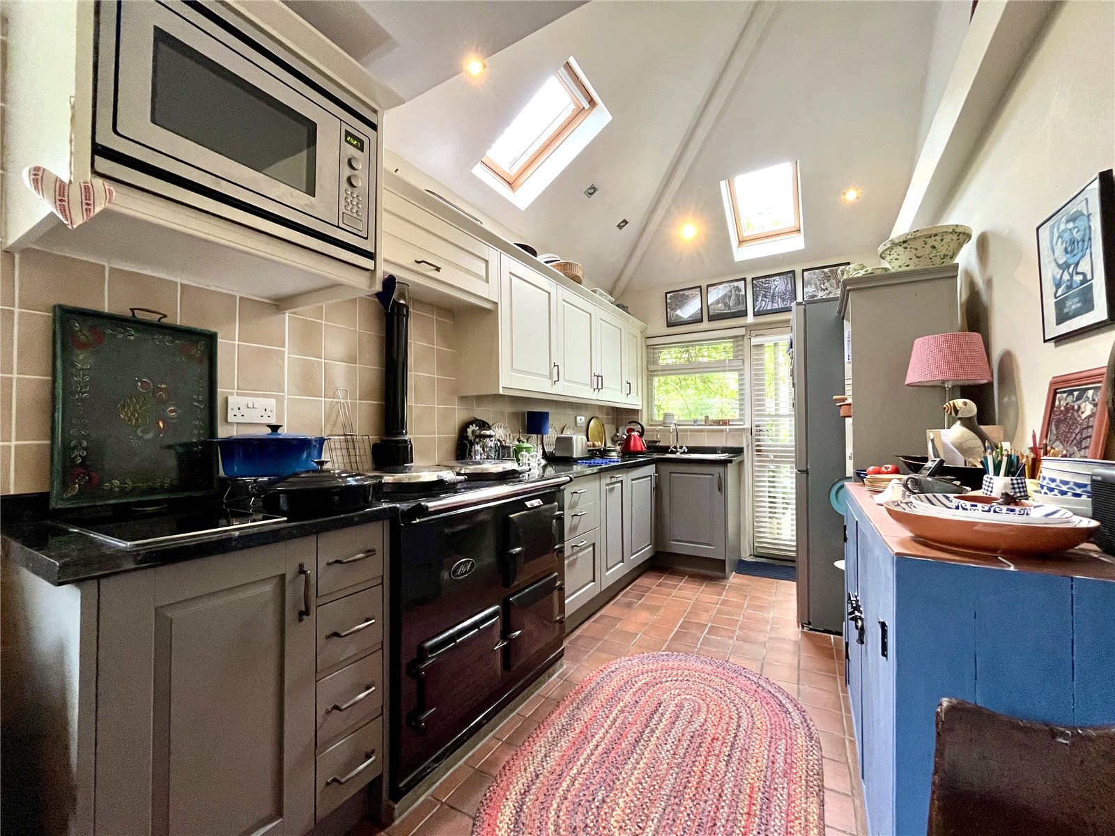 Full of noteworthy features this kitchen adds to the charm and character of this home, with open pitch and Velux roof lights allowing extra light. Fitted wall and floor units with worktops incorporating a one and a half stainless steel sink with single drainer and mixer tap over. Two ring ceramic hob. Tiled flooring. Dining area to one end.