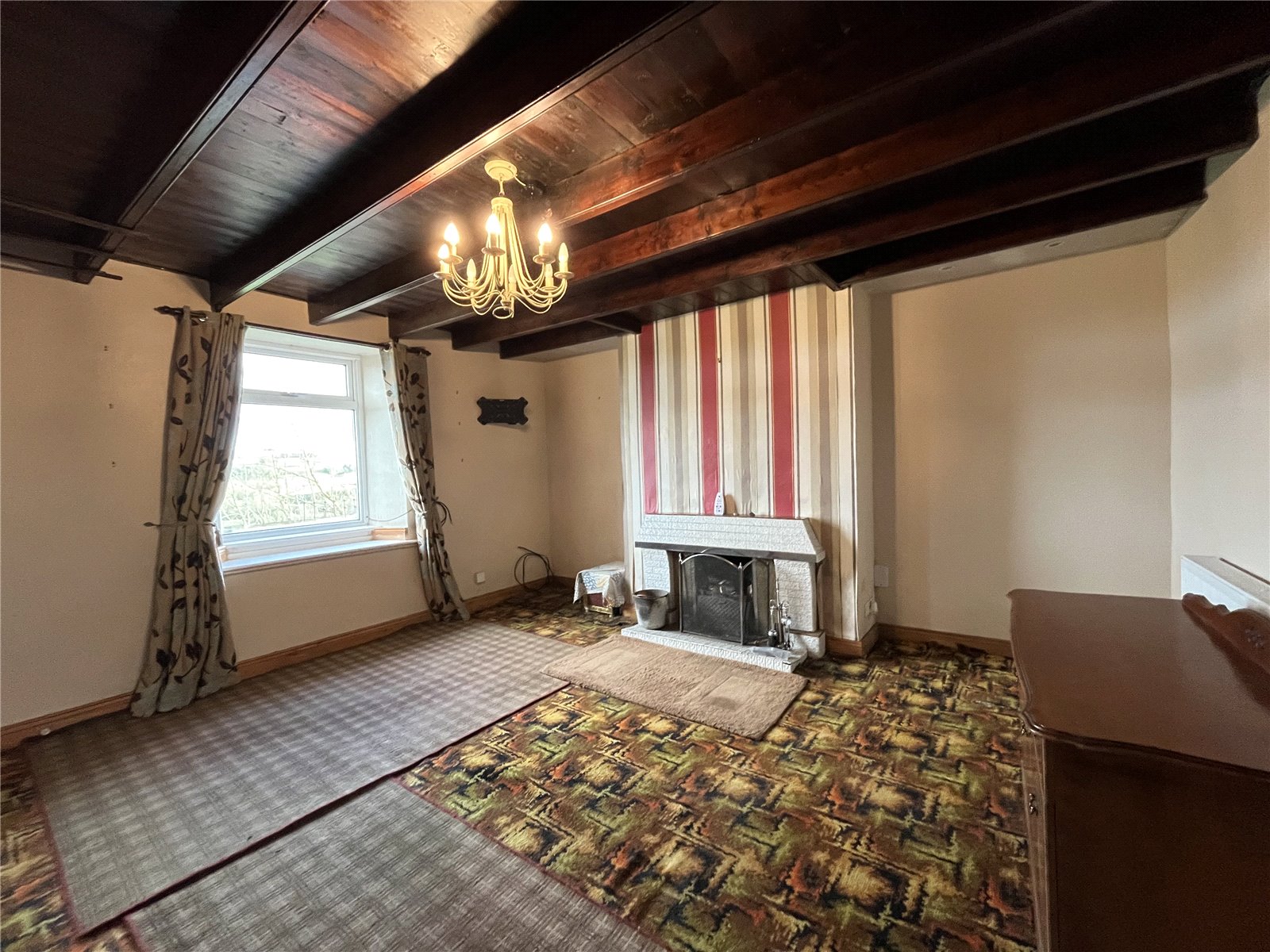 Window to the front enjoying stunning views. Tiled fireplace and hearth incorporating an open fire and heavy beamed ceiling. Large and useful storage cupboard under stairs.