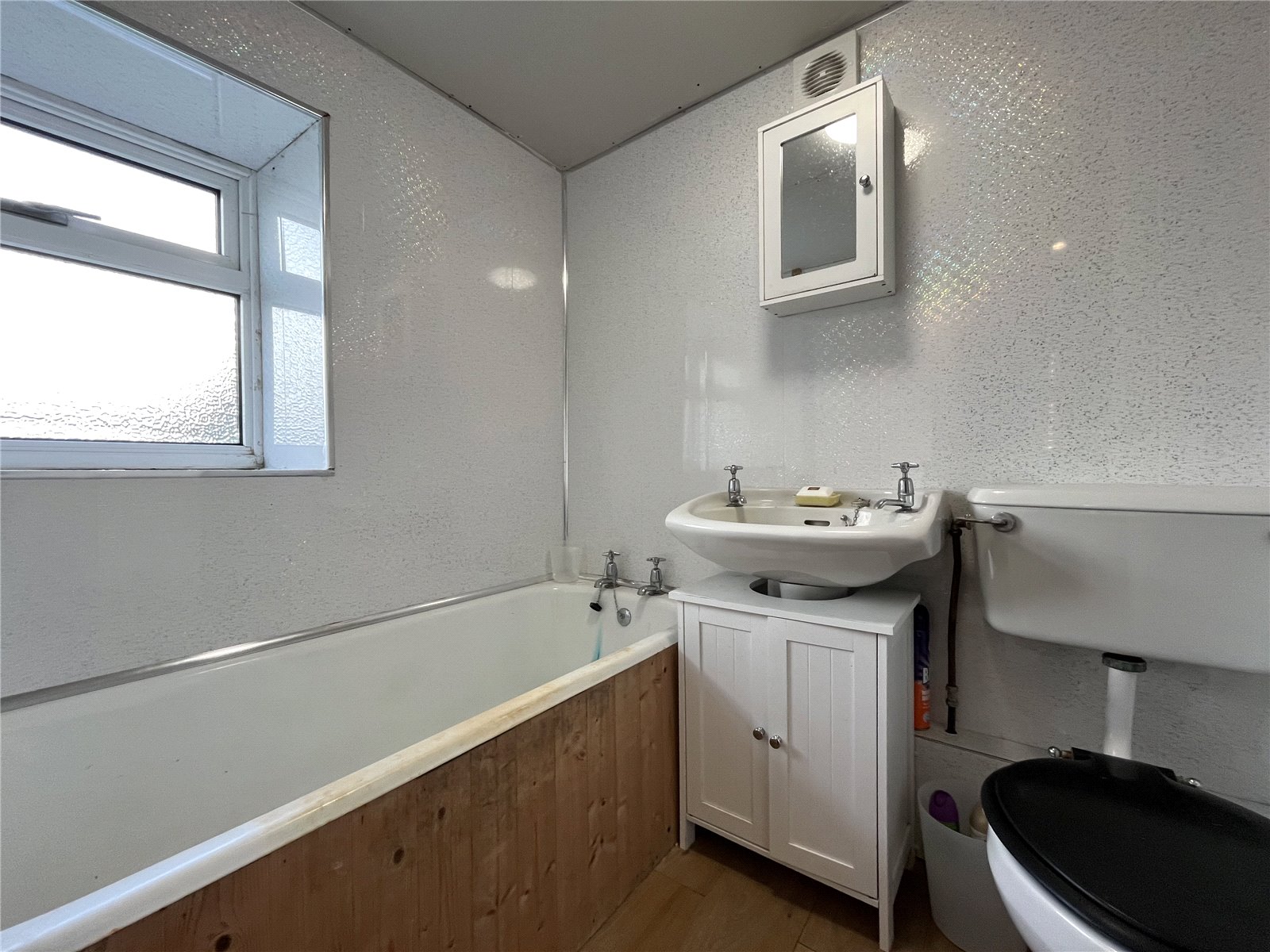 Panelled bath, wash hand basin low level WC, splash boarding to walls and chrome heated towel rail.