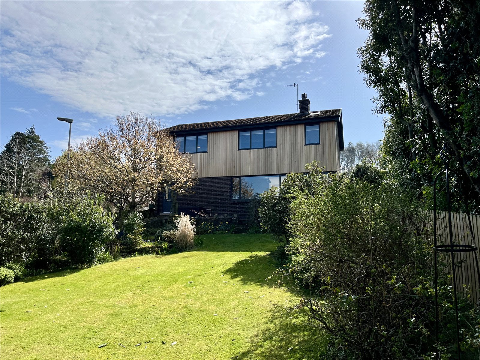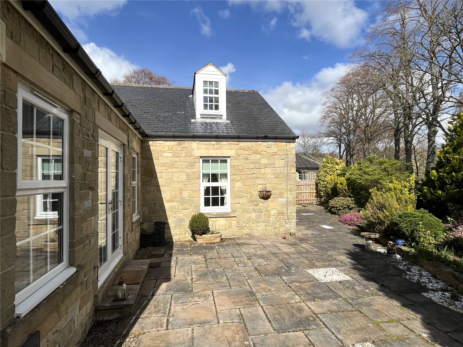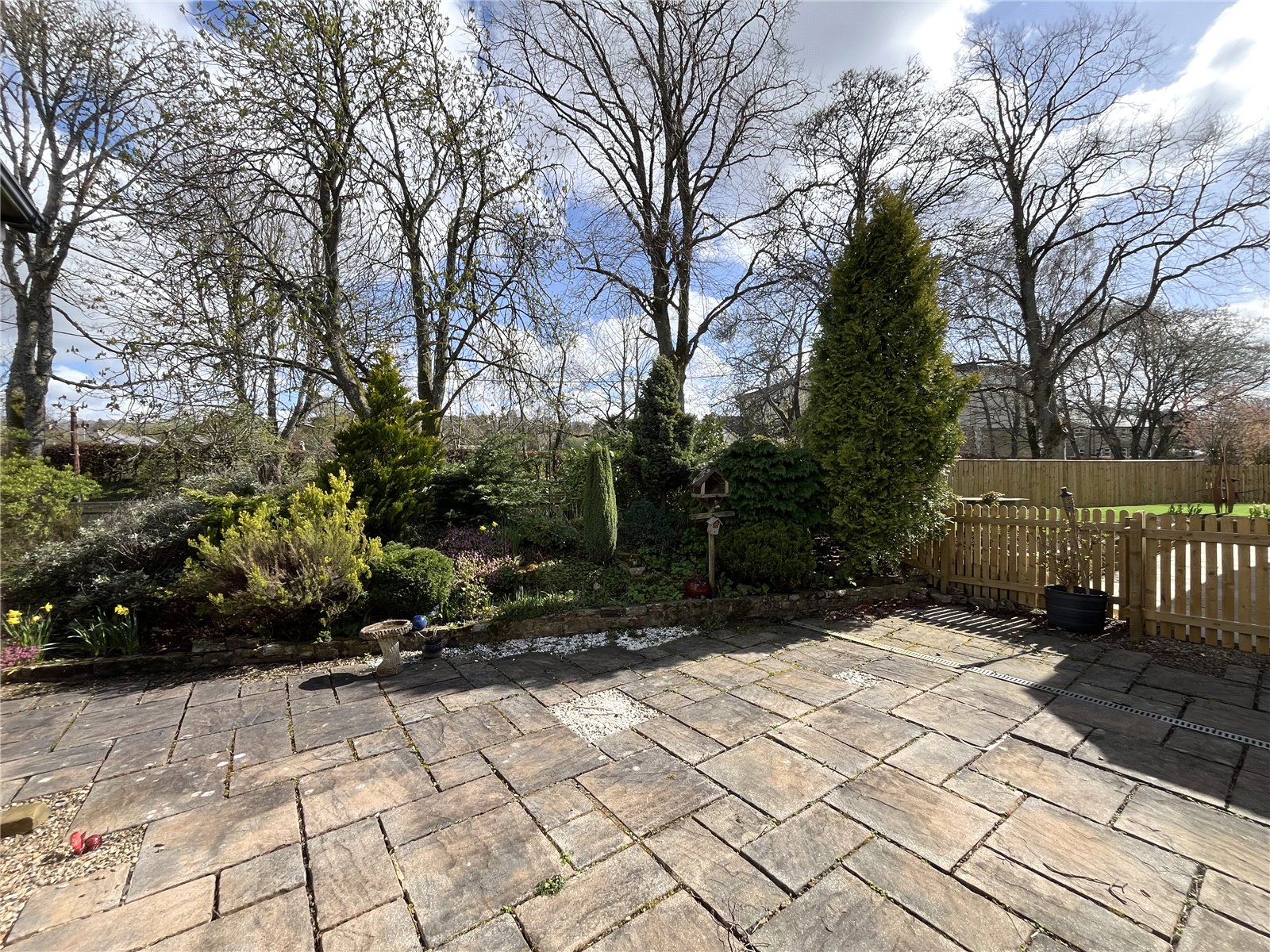 To the front, side and rear are well established gardens comprising lawned areas, mature trees, bushes, shrubs and flowerbeds. Very large patio areas and flagged pathways.