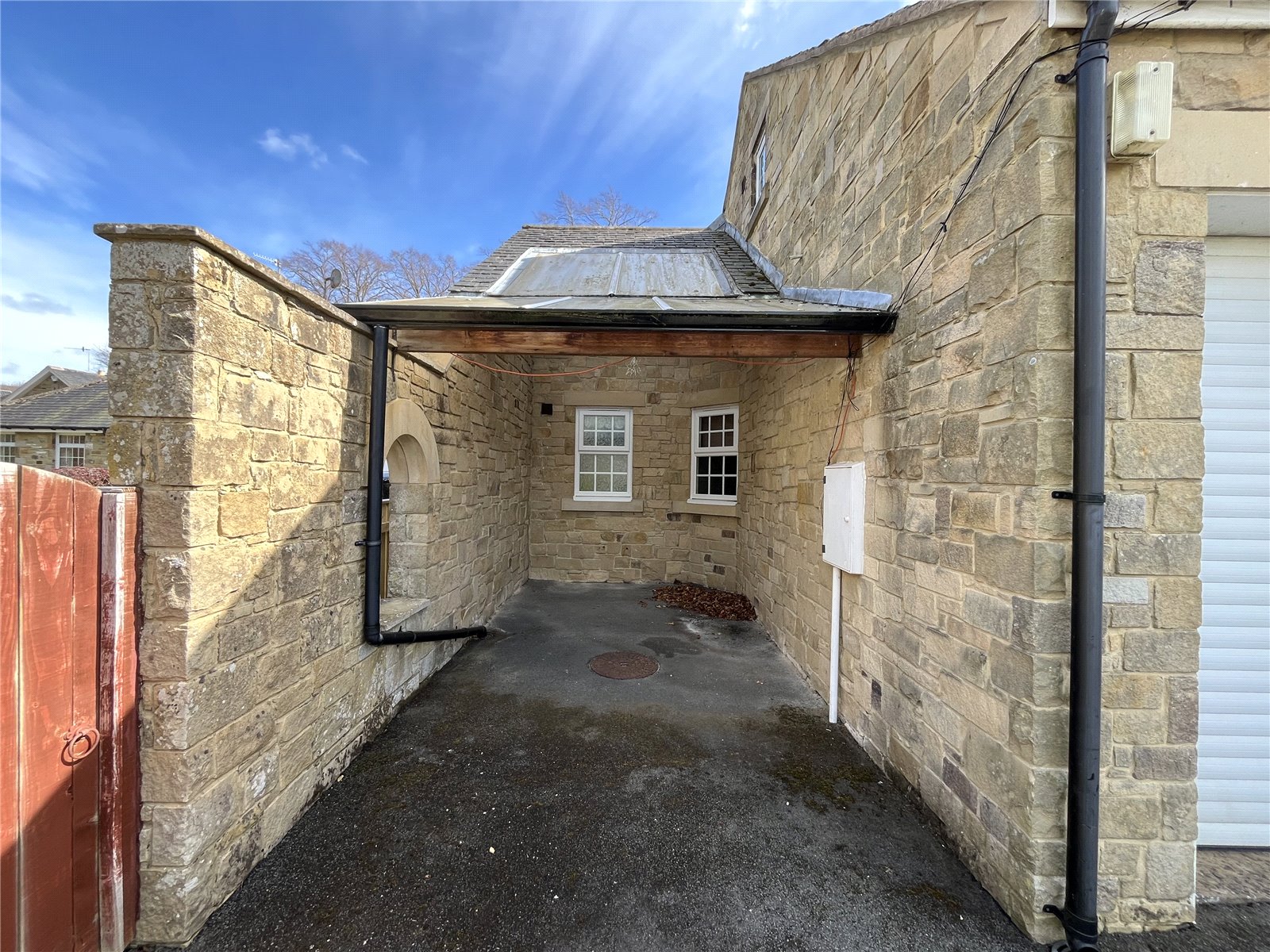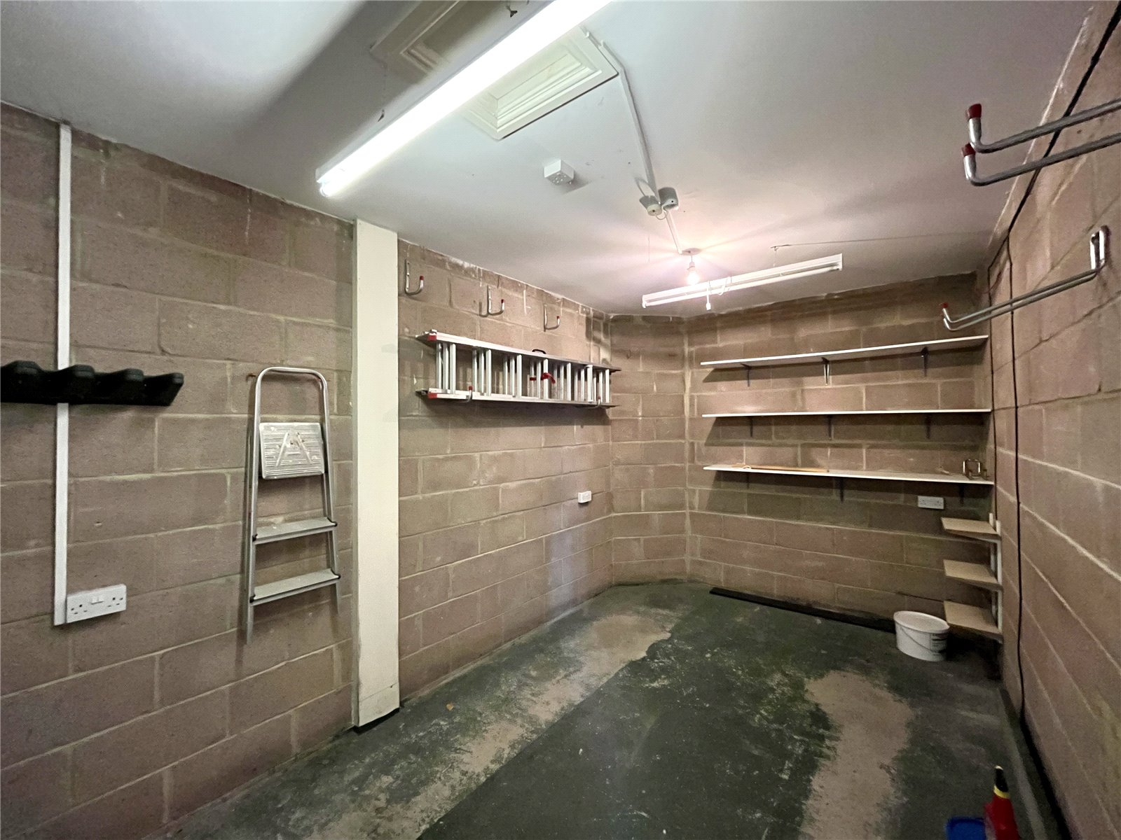 With powered/remote roller shutter main door, fitted shelving. Additional driveway parking for two to three cars.