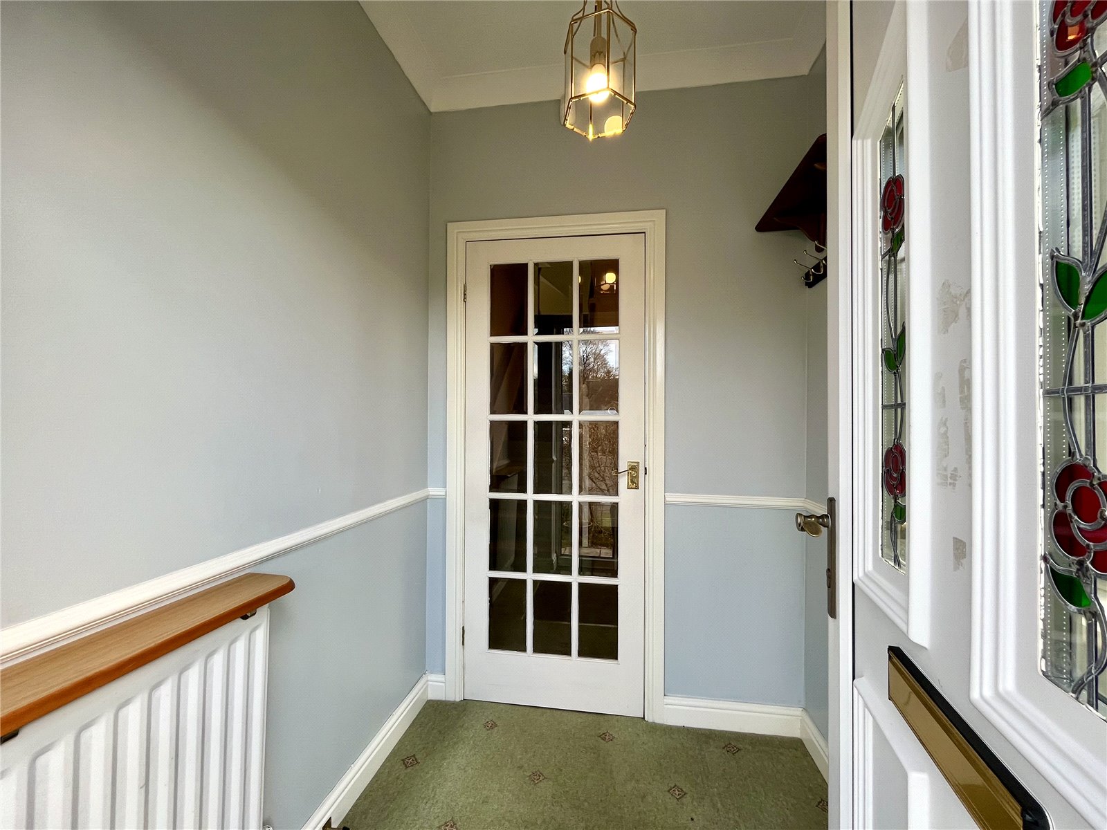 uPVC front door with coloured glazed insets. Ceiling cornice. Fifteen light door to: