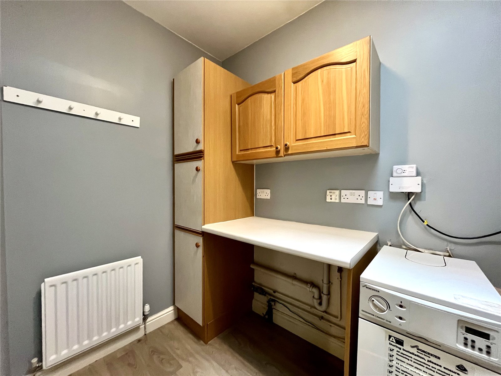 Fitted units and worktop, plumbing for washing machine. Oil-fired central heating boiler.
