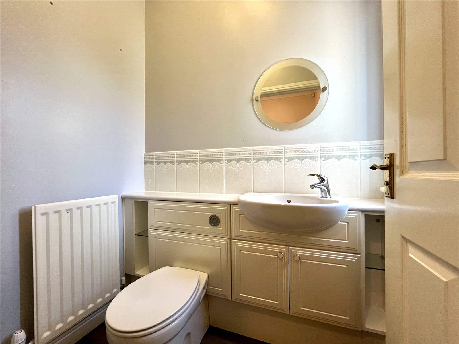 Wash hand basin with cupboard under, low level WC and tiled splash back.