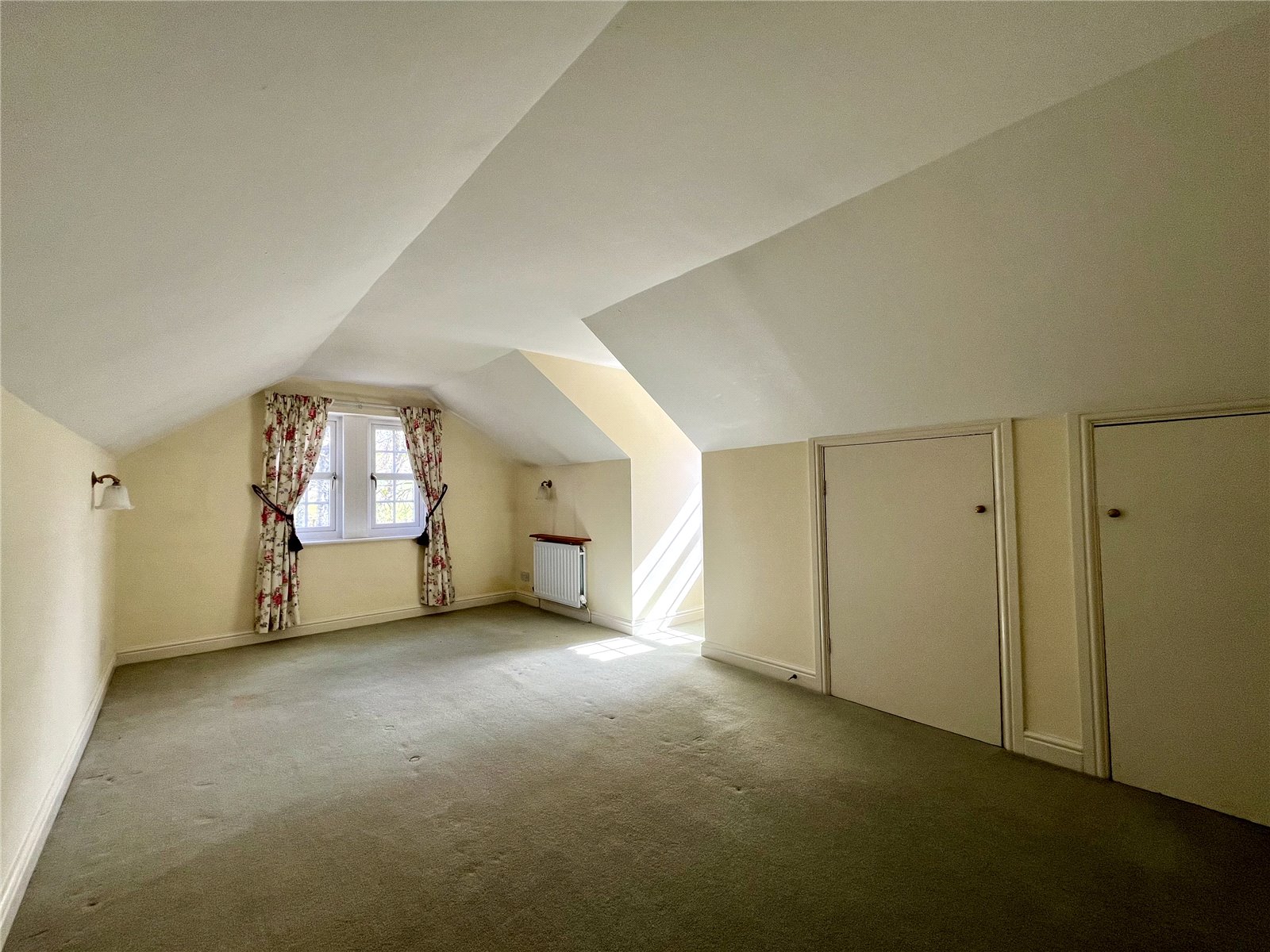 A generous sized room with sloping ceilings, three built-in cupboards, window to two aspects.