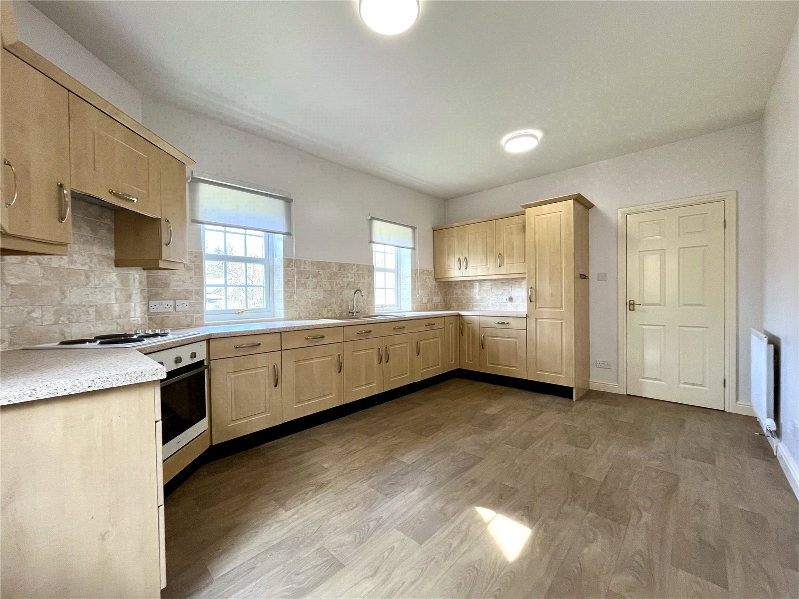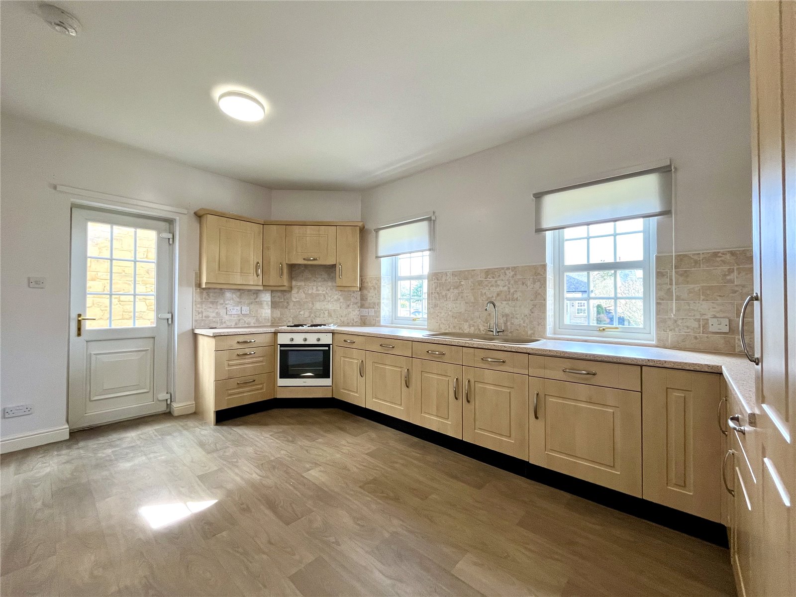 Fitted wall and floor units with worktops incorporating a one and a half sink unit with single drainer and mixer tap over. Four hob cooker with oven under and extractor hood over, tiled splash back, integrated dishwasher with matching fascia. uPVC rear door.