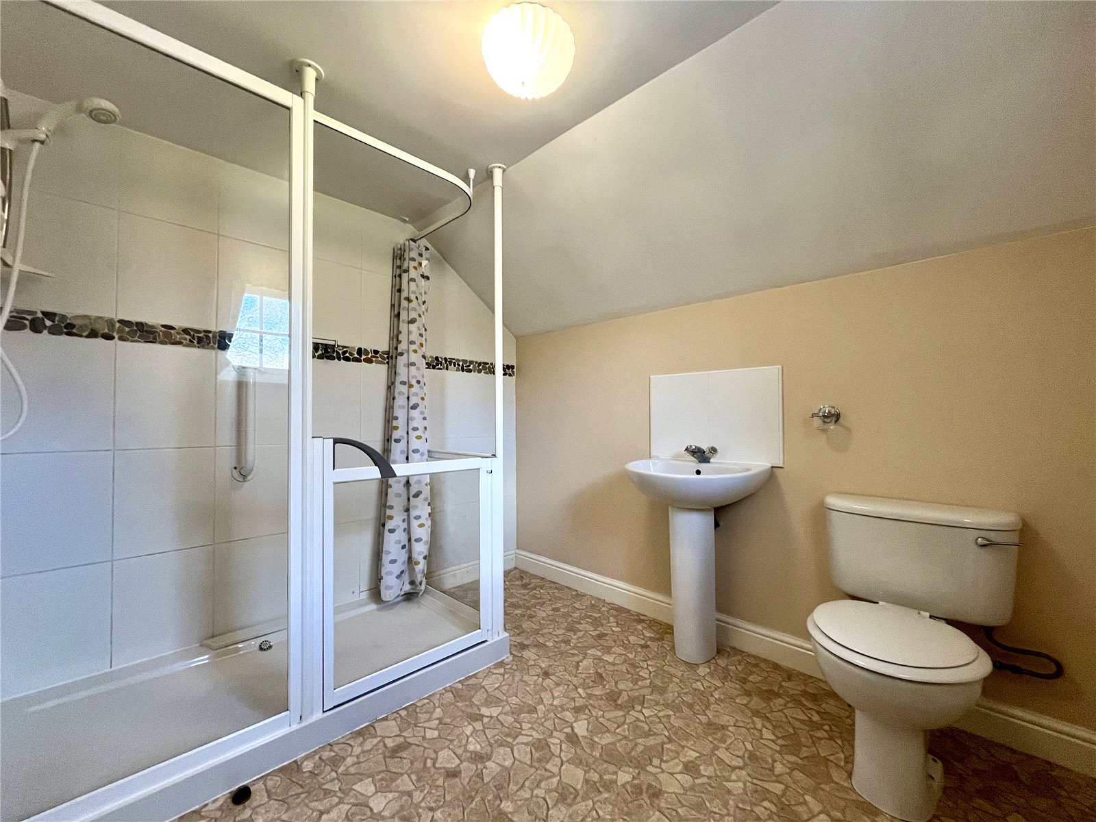 Walk-in shower unit with electric shower over, pedestal wash hand basin and low level WC and tiled splash back.
