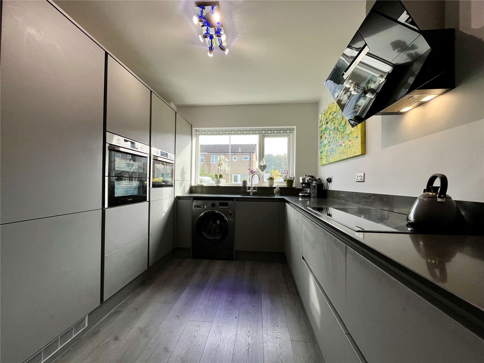 Recently fitted with handleless grey cabinetry with quartz worktops over incorporating a one and a half stainless steel sink with single drainer and mixer tap over. Five induction hob cooker with contemporary style extractor canopy over. Integrated dishwasher and tall fridge, both with matching fascias. Built-in double ovens and separate microwave. Plumbing for washing machine.