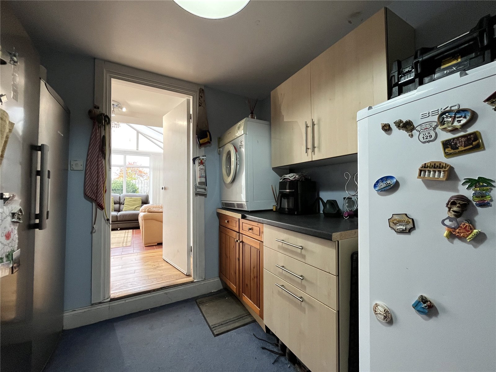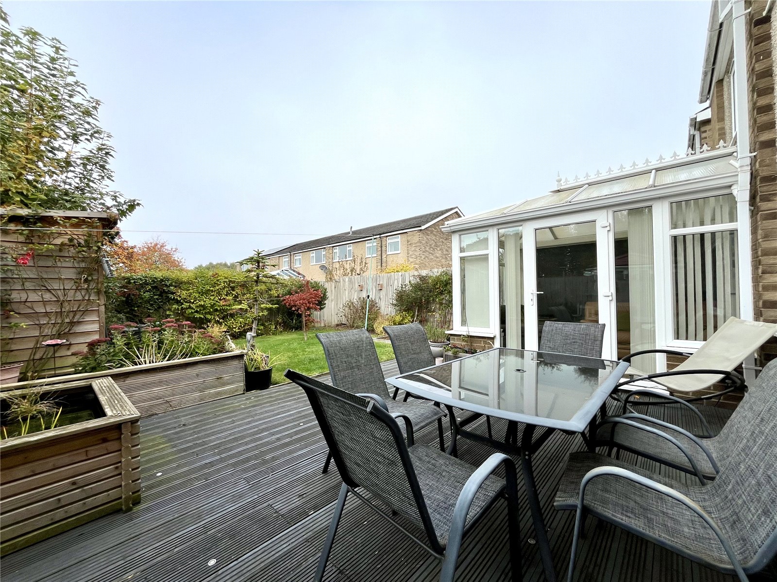 A spacious addition to the rear with ceramic tiled flooring and glazed door to a large decked area and gardens. Large built-in storage cupboard with shelving.