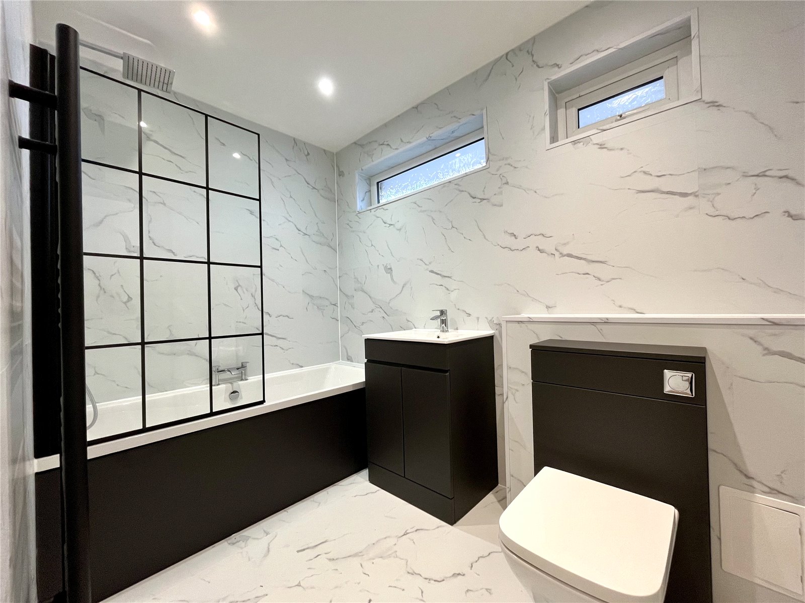 Panelled bath with shower over with rain head shower and separate body shower head, and glazed side screen, wash hand basin with cabinet below, low level WC, splash boarding to all walls and large heated towel rail.