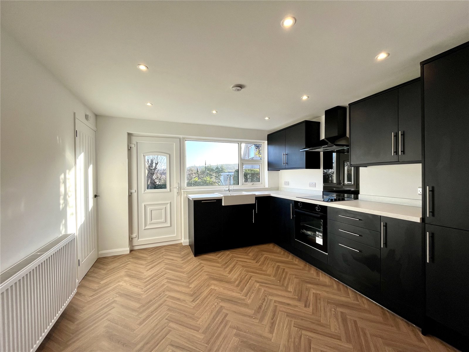 Refitted with wall and floor cabinets with light worktops over incorporating an enamel sink with mixer tap over. Four ring ceramic hob with single oven under and extractor canopy over. Fully integrated fridge and freezer, washing machine and dishwasher, all with matching fascias. uPVC rear door to gardens. Built-in boiler cupboard with gas fired central heating boiler.