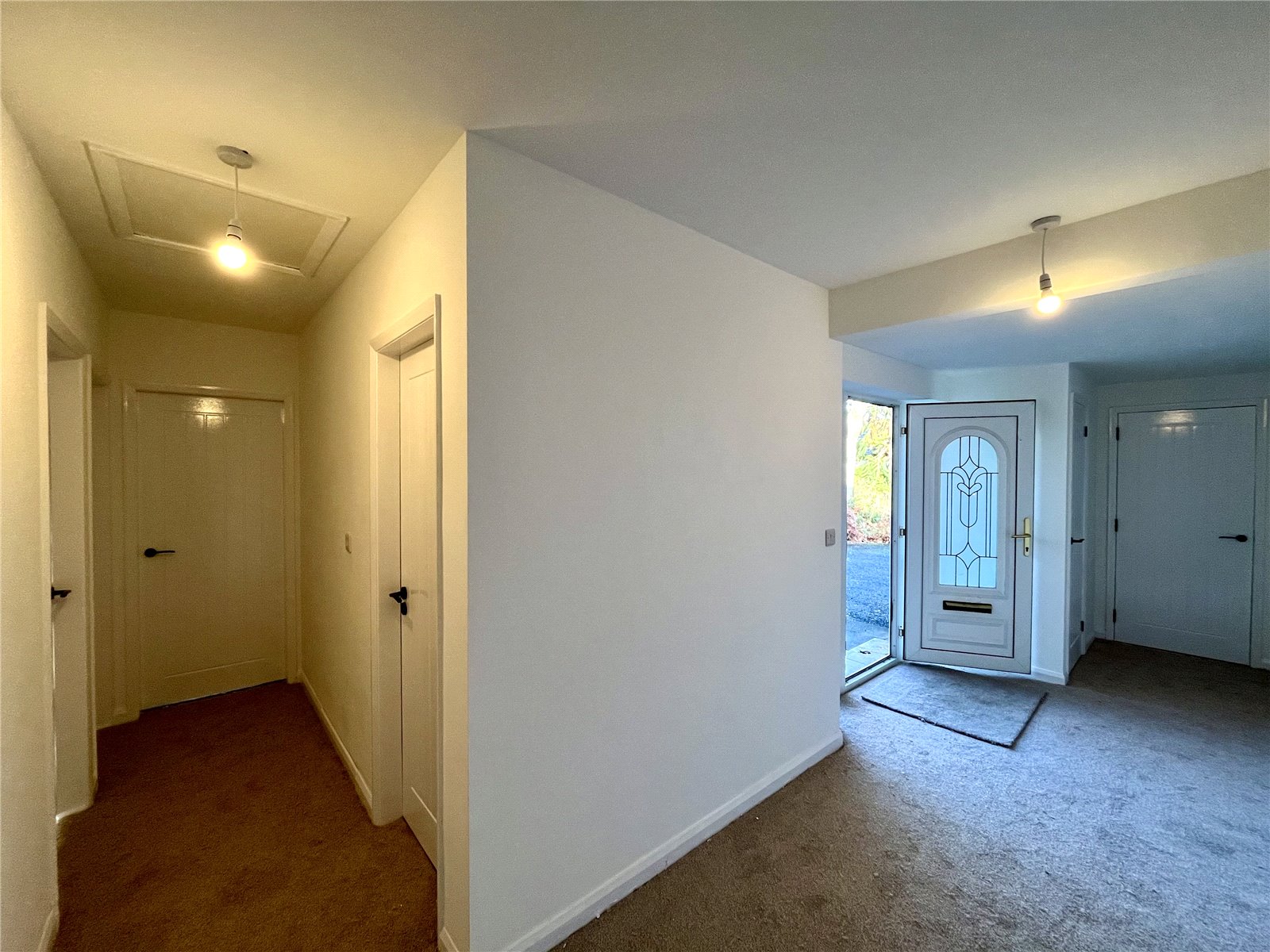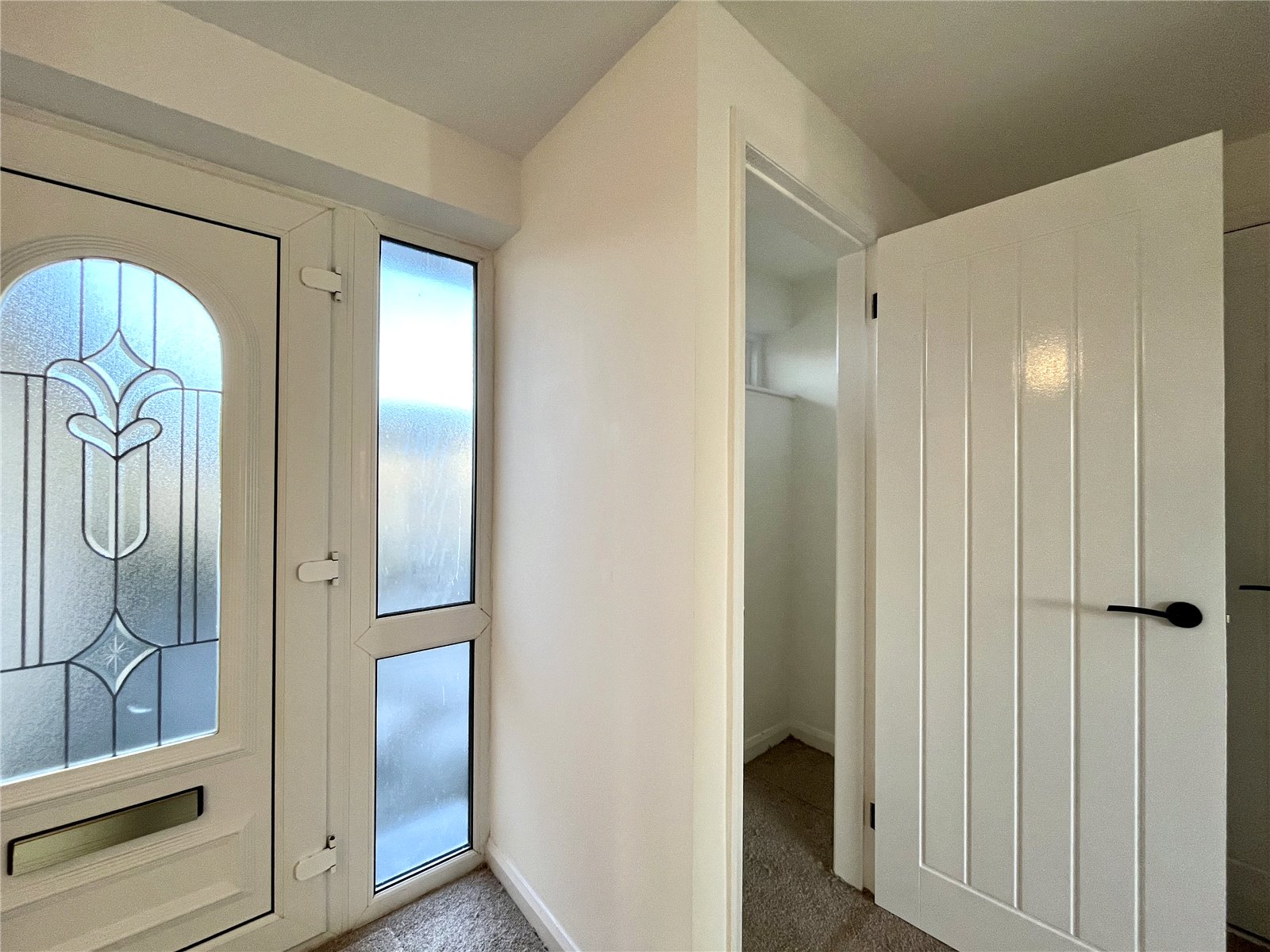 uPVC front door with glazed inset and glazed side panels either side. large storage/cloaks cupboard.