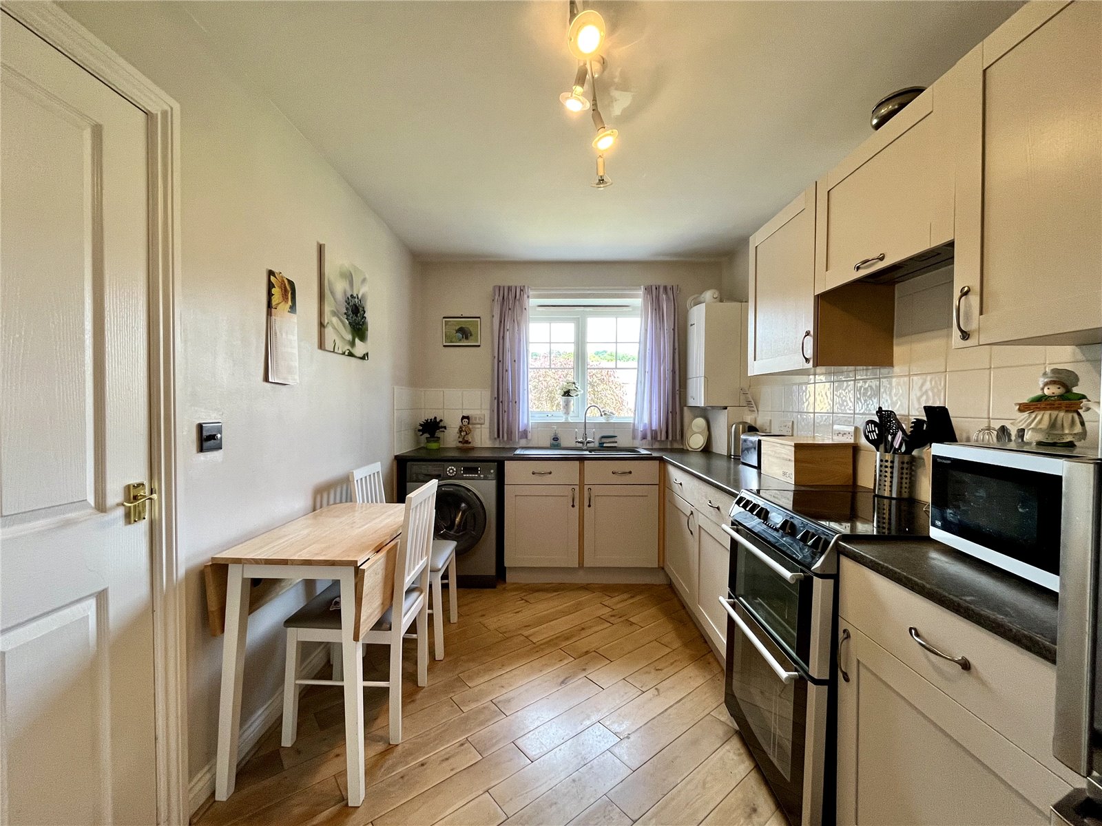 Fitted wall and floor units with worktops incorporating a single sink unit with single drainer and mixer tap over. Electric cooker point/recess with extractor hood over, tiled splash back, plumbing for washing machine and space for tall ridge/freezer.