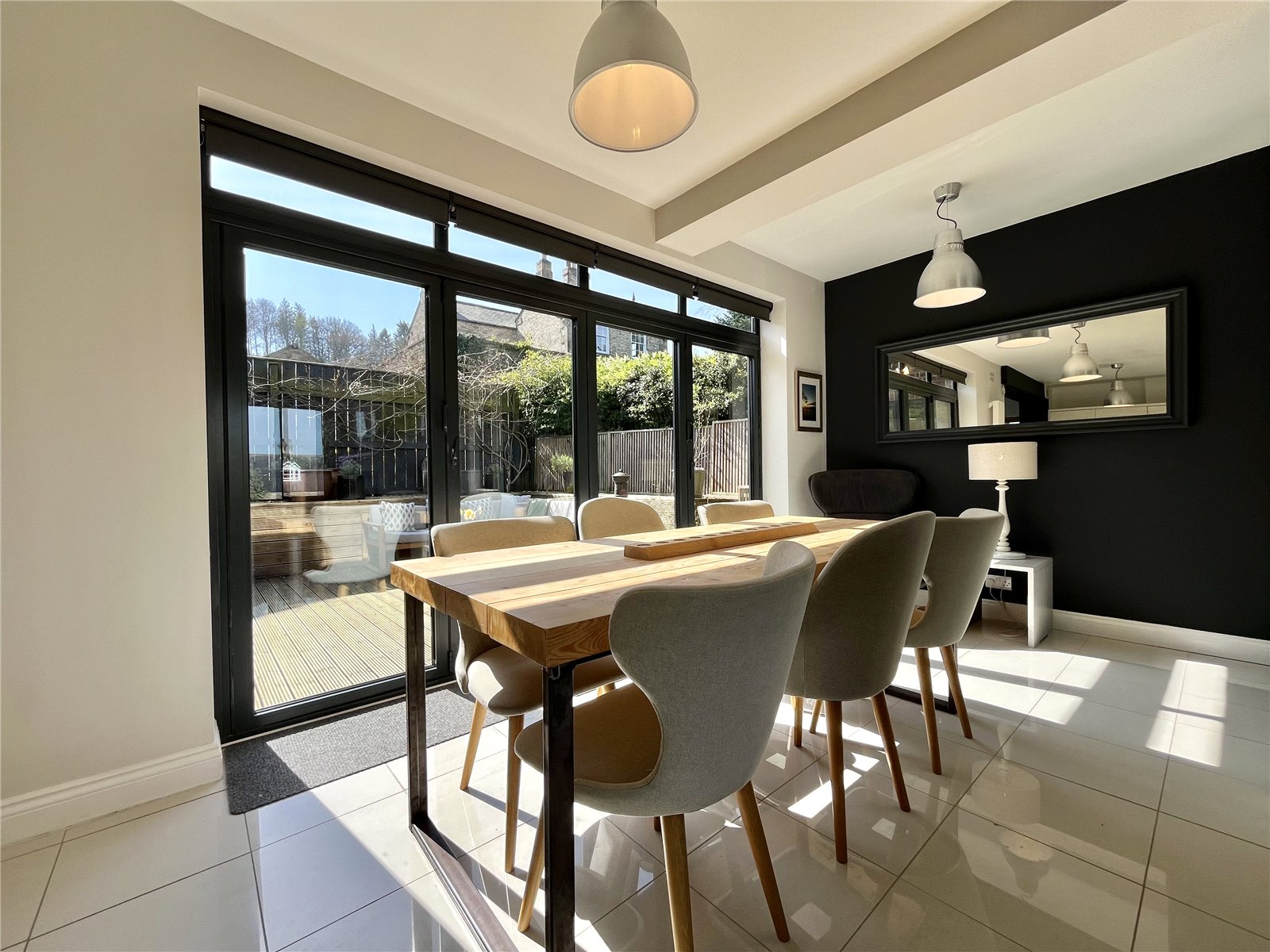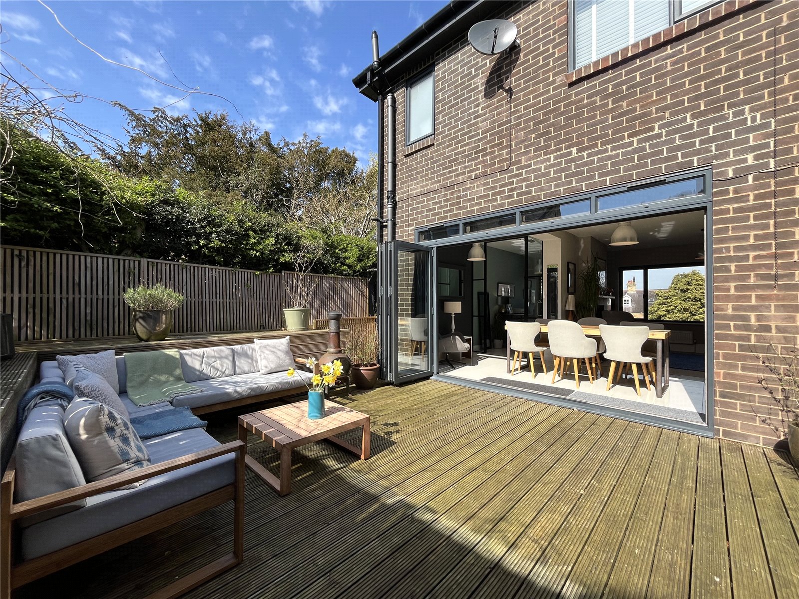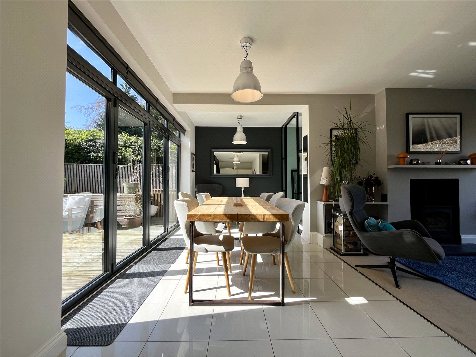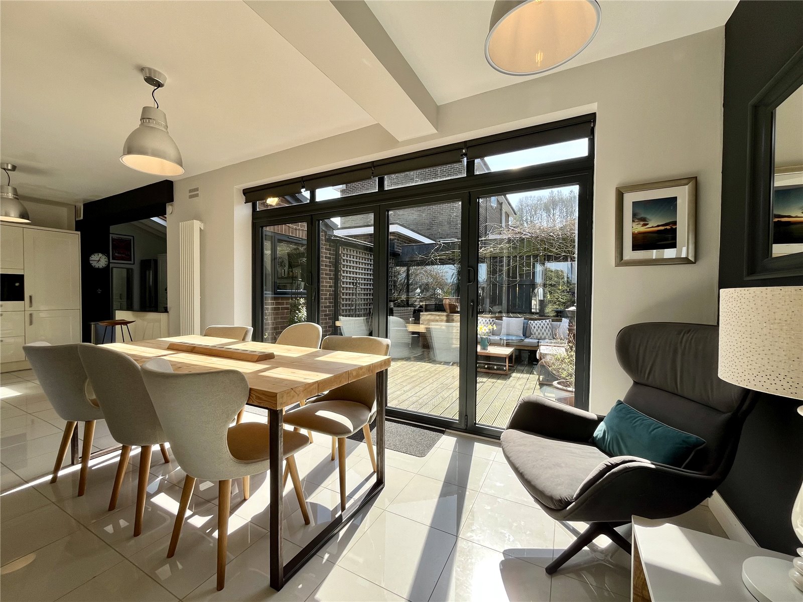 With attractive white ceramic tiled flooring throughout. Bi-folding doors lead out onto a decked patio.