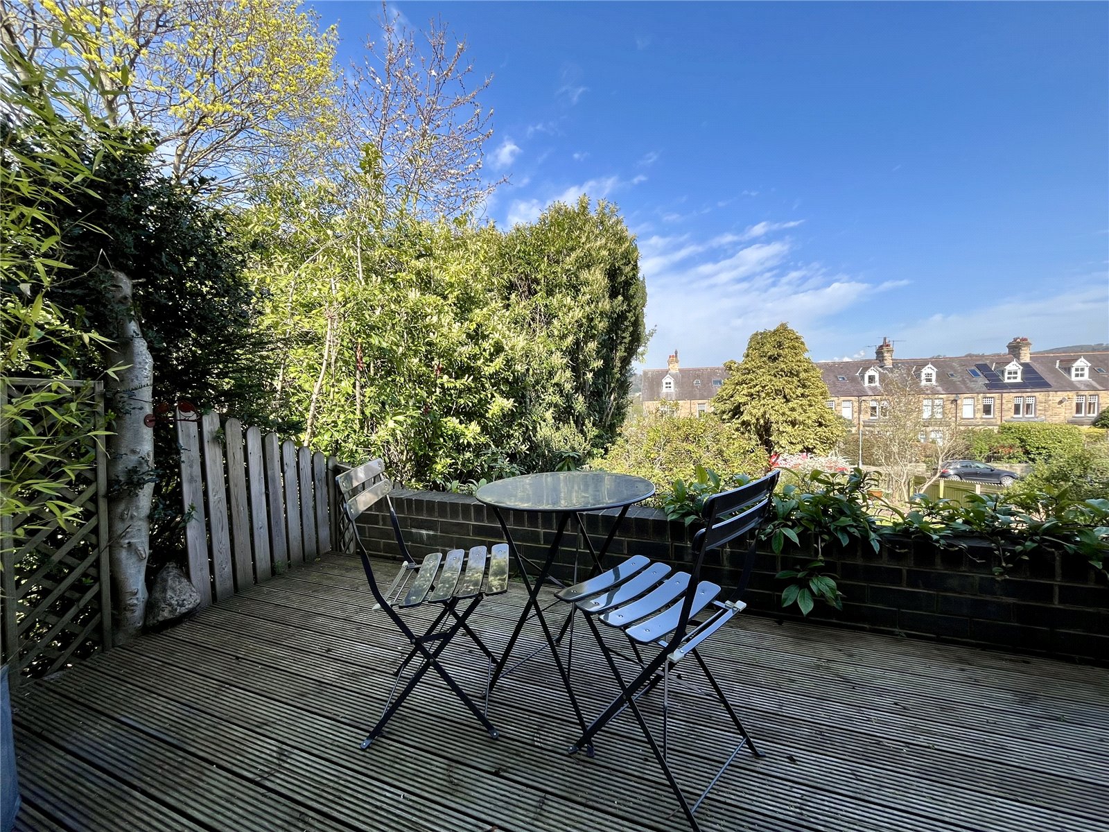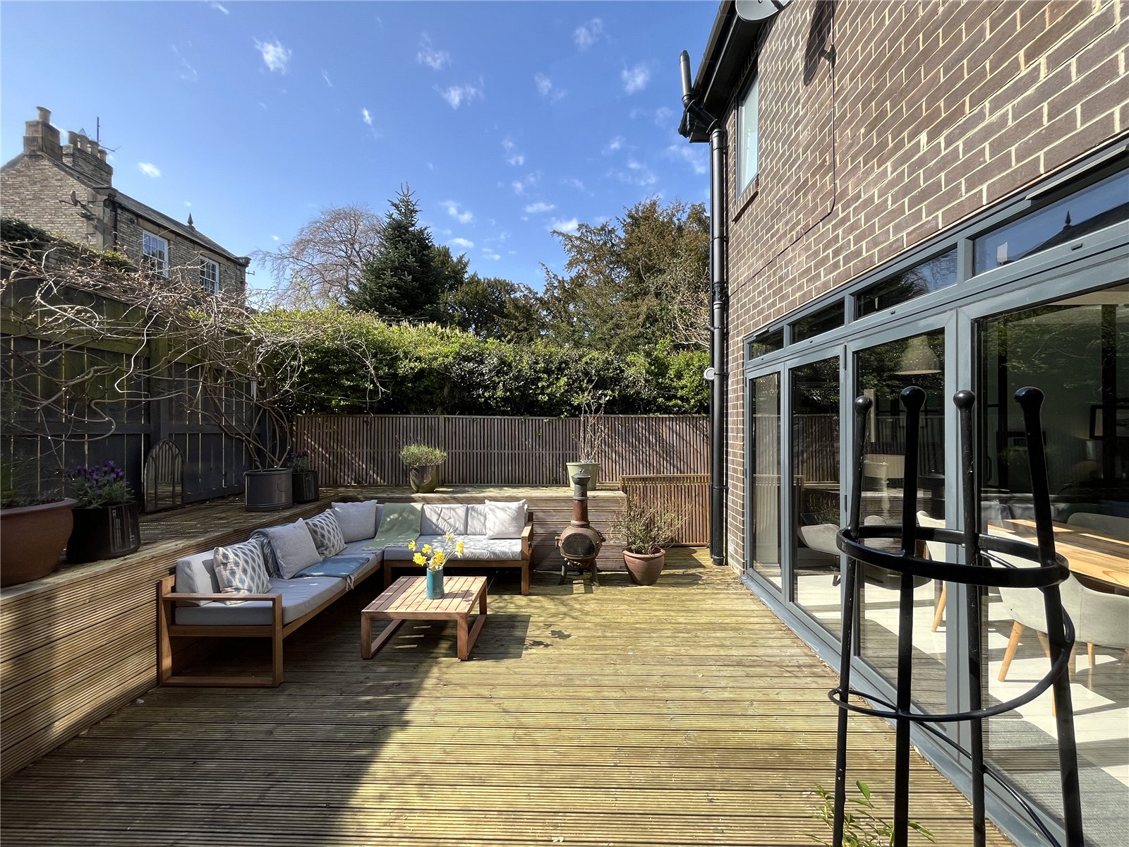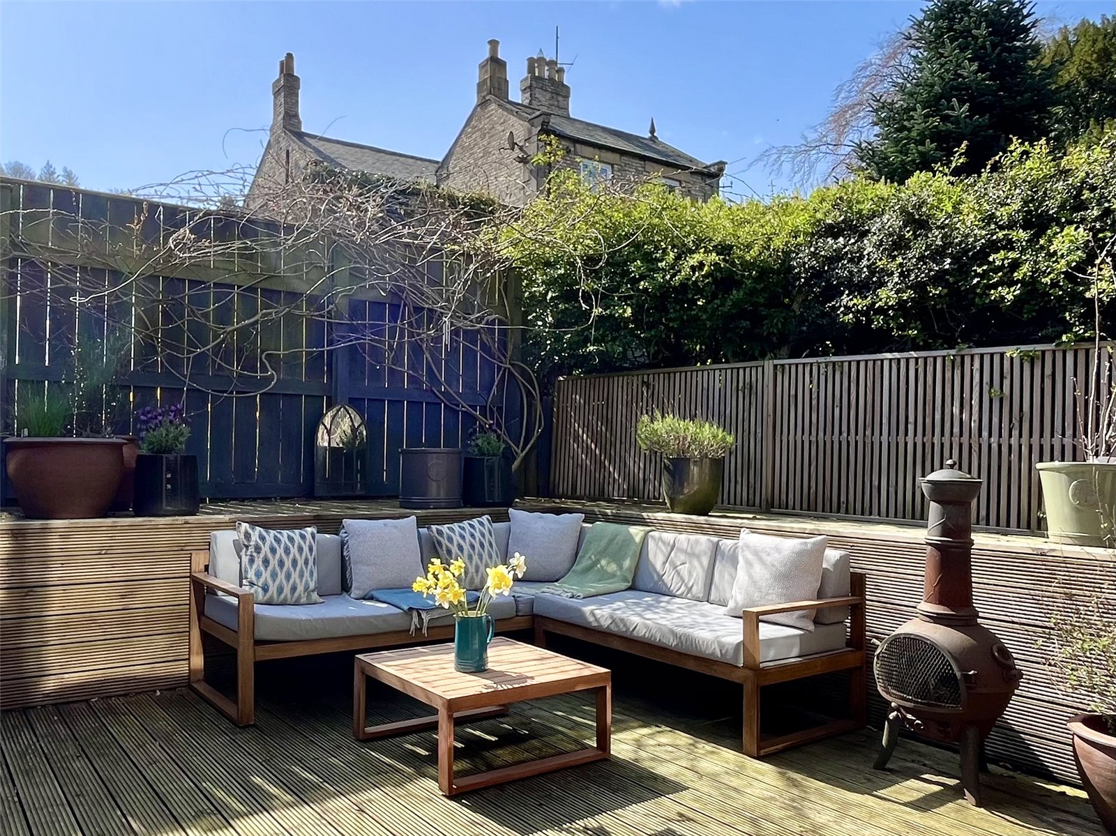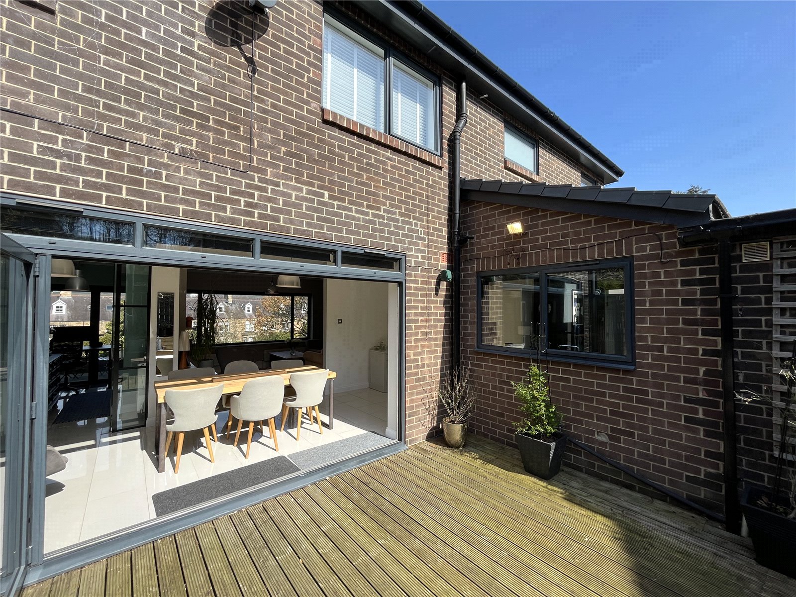 To the front are well-laid out and maintained mature gardens with lawned areas, trees, bushes, shrubs and flower beds, all overlooked by a raised decked terrace. To the rear is an enclosed decked patio, enjoying a southerly aspect and a high degree of privacy.