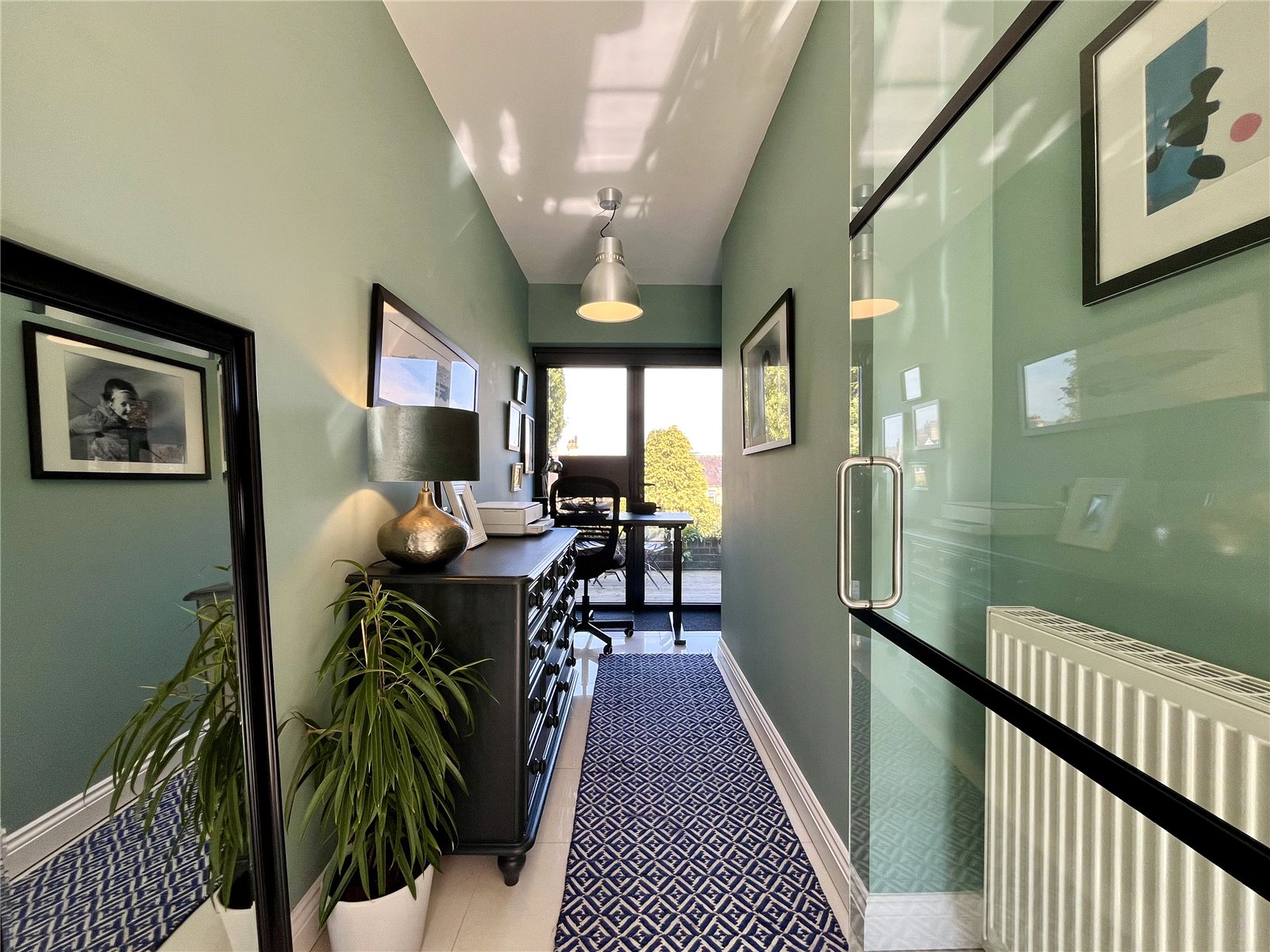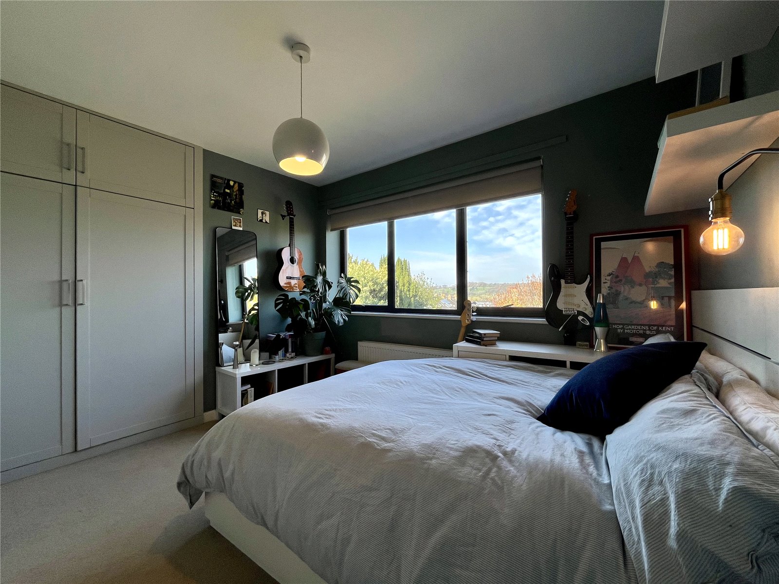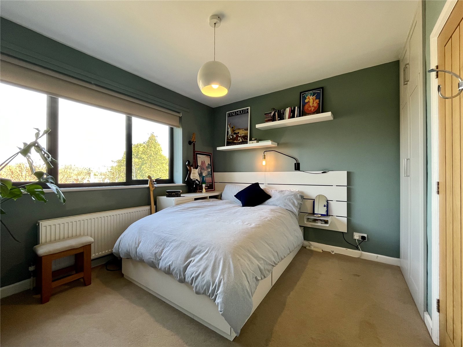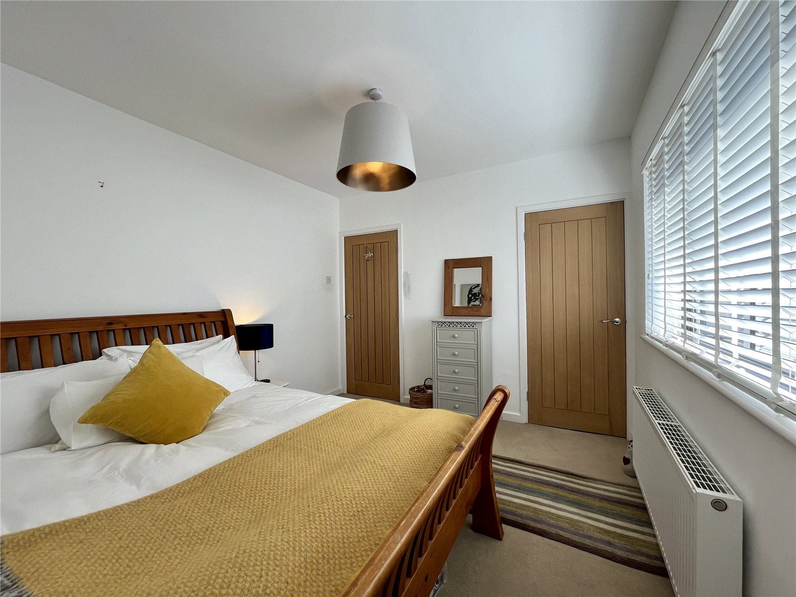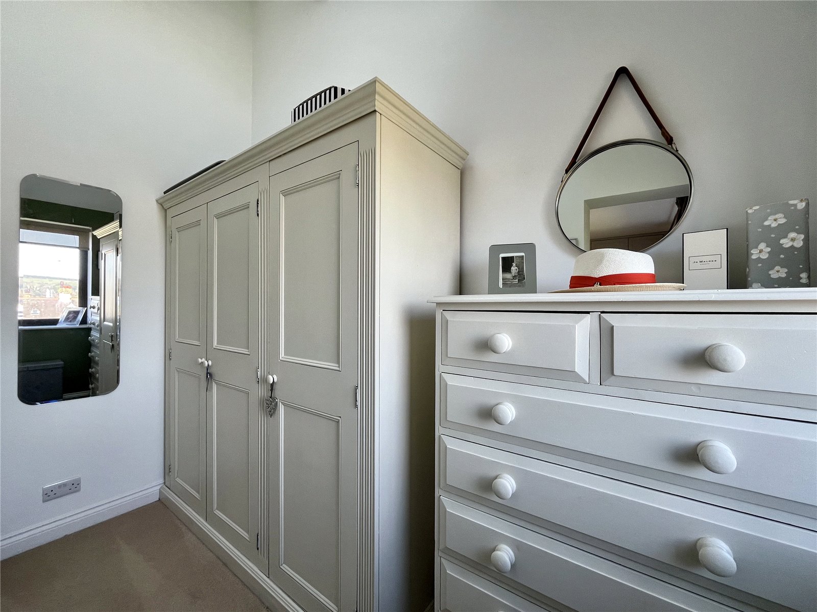 A large picture window to the front enjoys far reaching views. Bespoke fitted wardrobes custome made by Nook Design with hanging and shelving space.