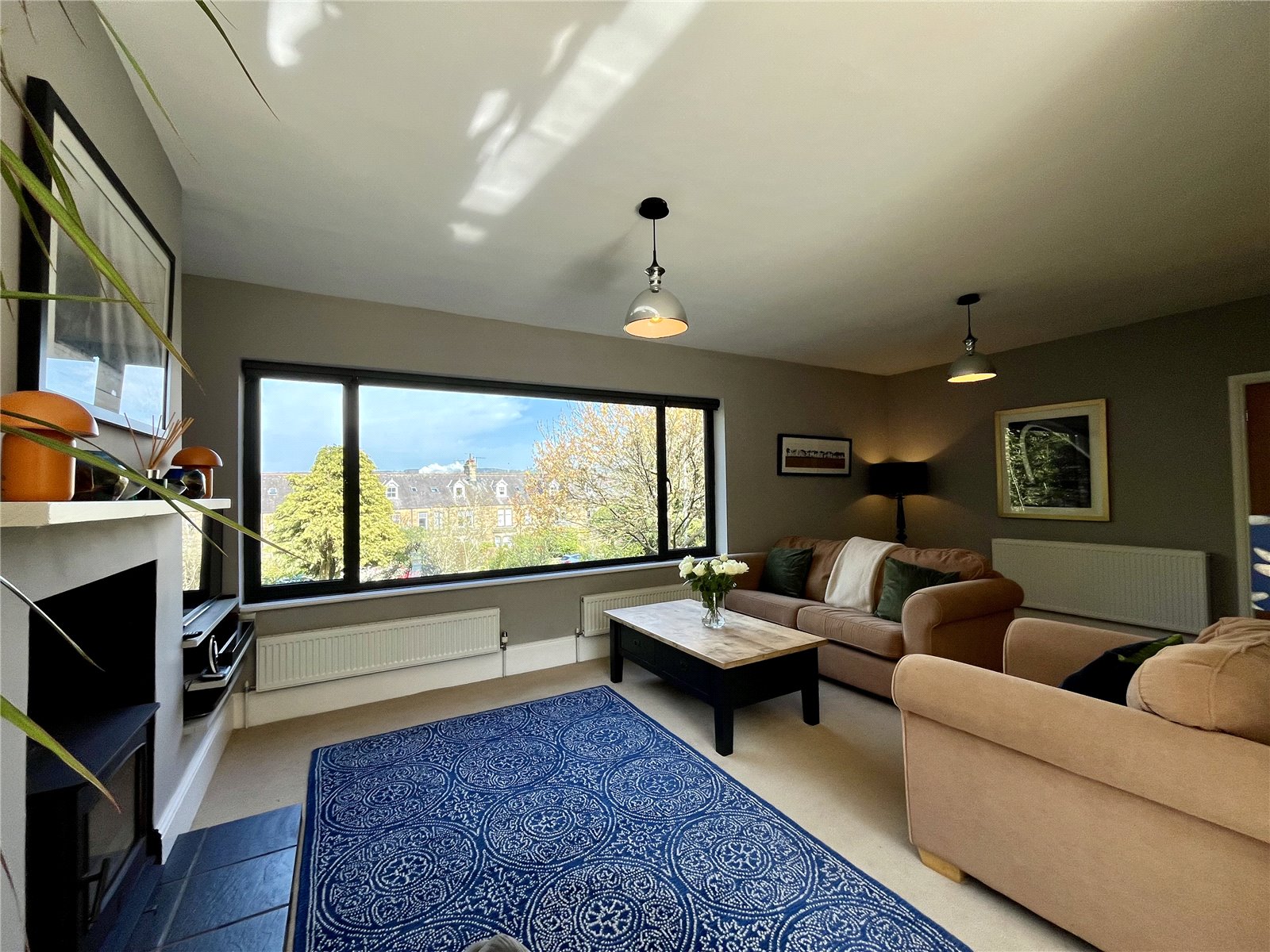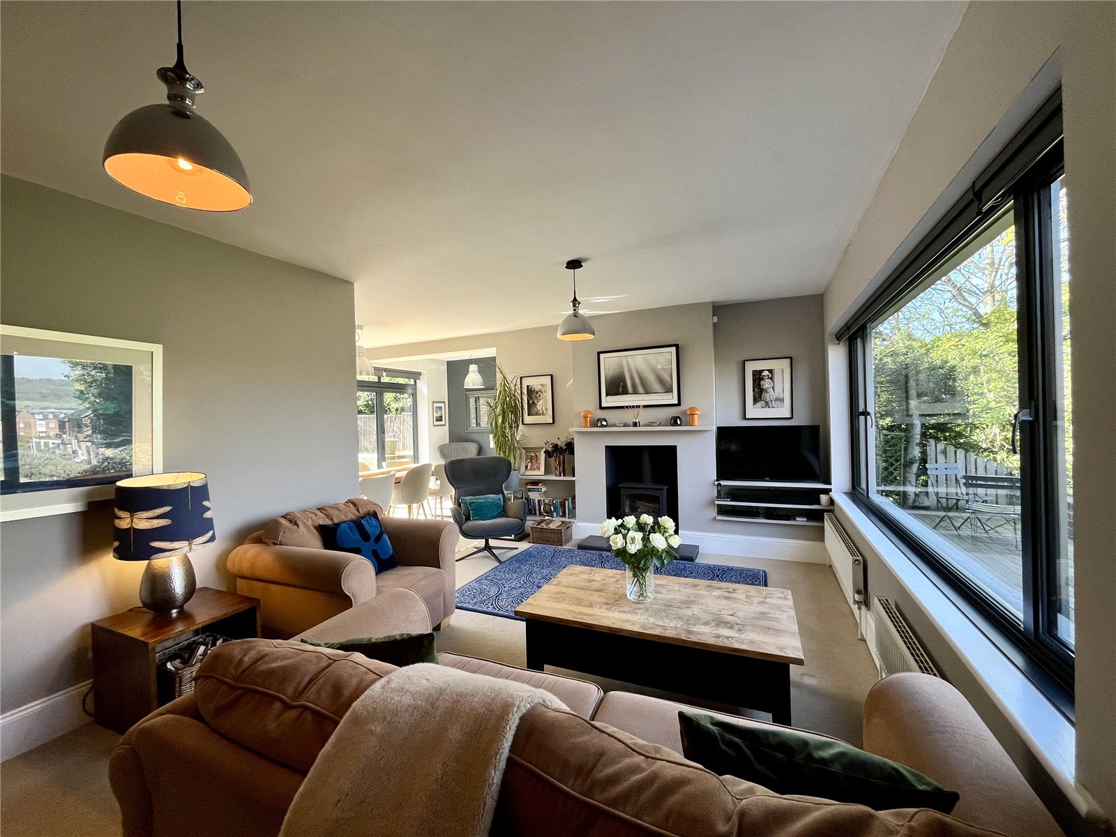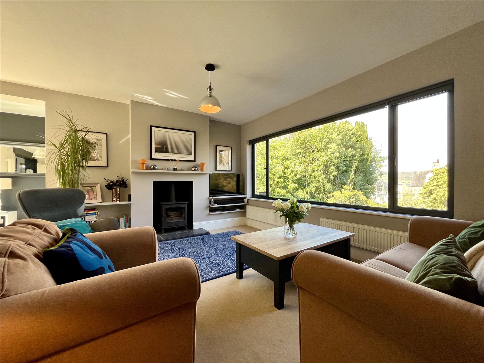 A spacious, light and airy room with a large picture window enjoying a pleasant outlook.. Fireplace recess housing a wood-burning stove on a tiled hearth, built-in shelving either side. Open plan to: