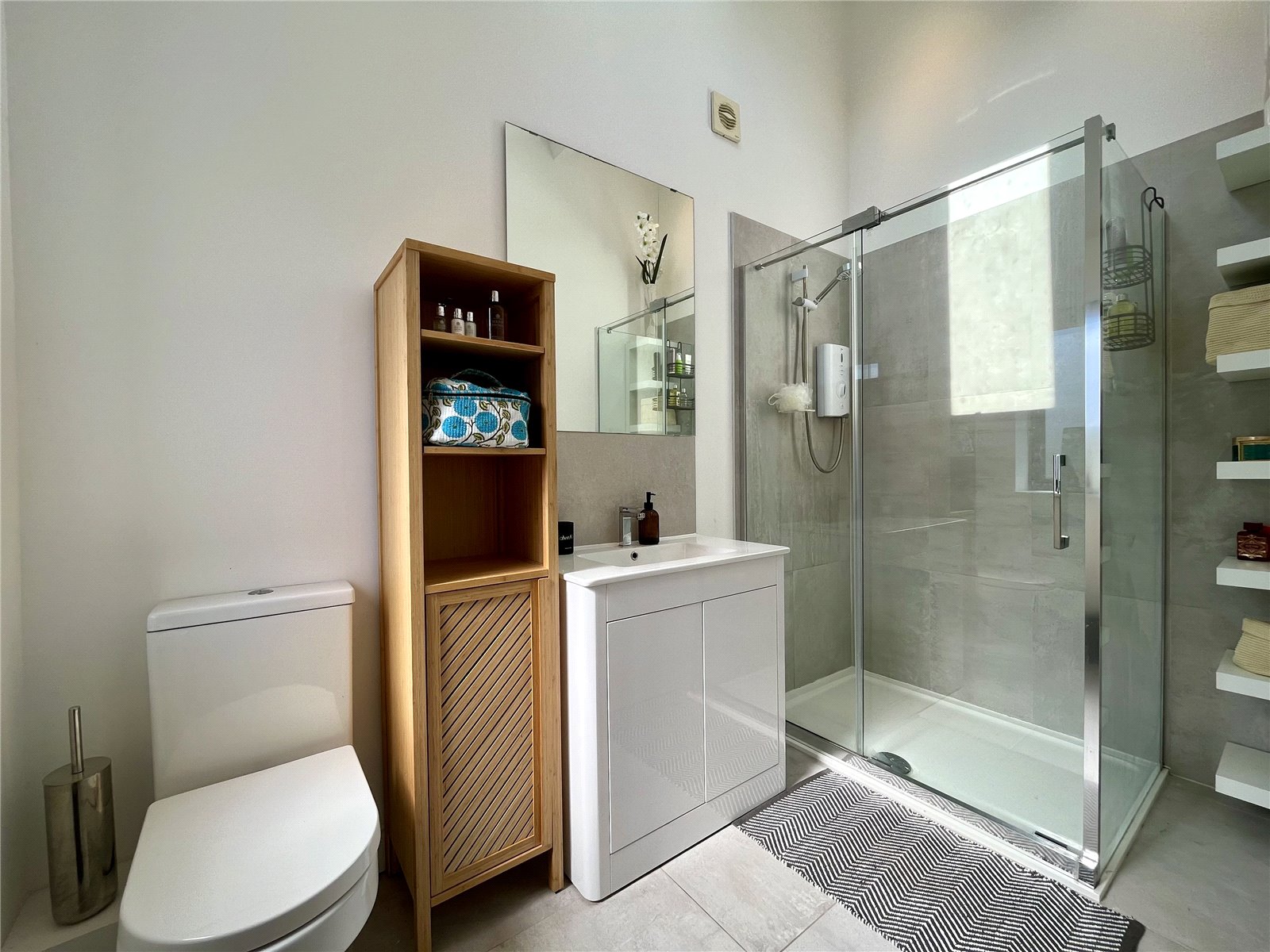 Large double sized shower cubicle, wash hand basin with cabinet under, low level WC, chrome heated towel rail, tiled splash backs and ceramic tiled flooring.