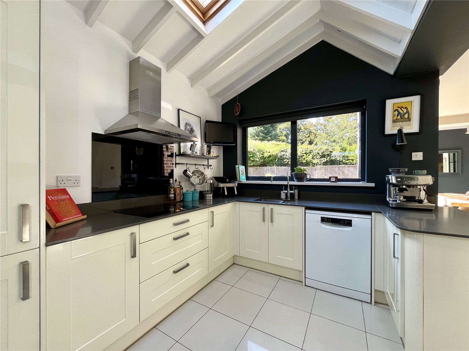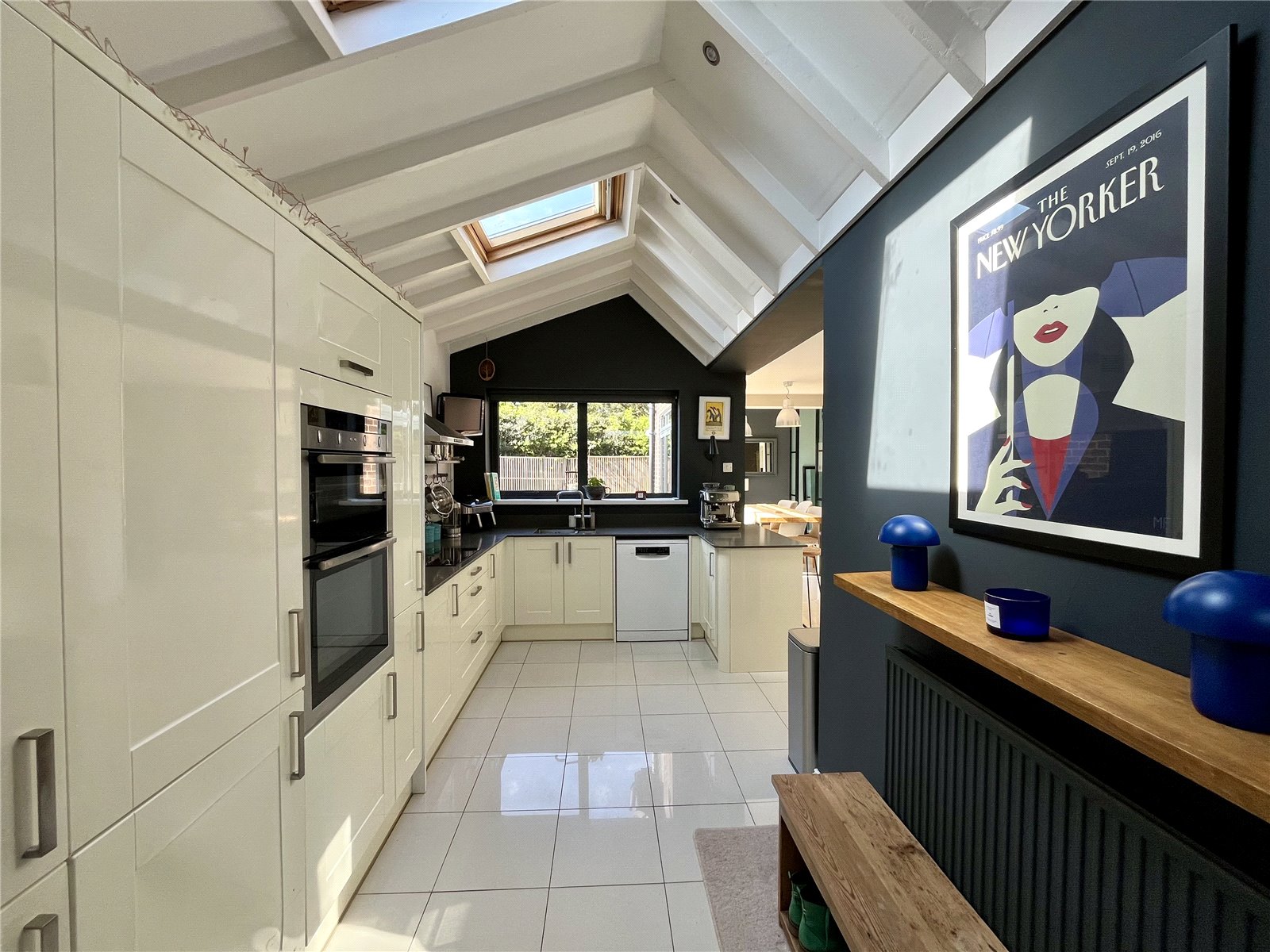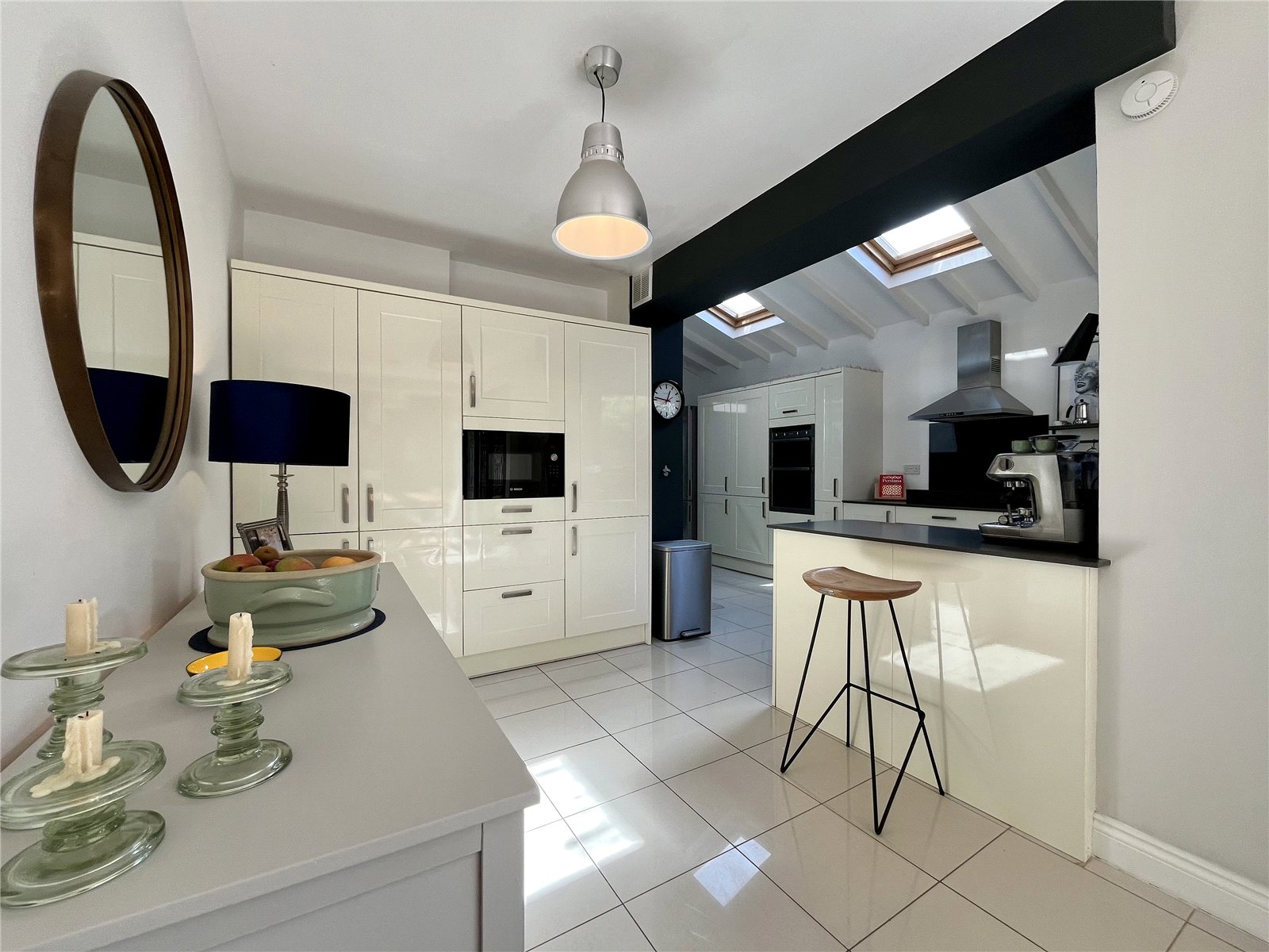 L-shaped room with matching ceramic tiled flooring throughout. Extensive range of fitted cabinetry with quartz worktops over incorporating a one and a half stainless steel sink with mixer tap over. Four ceramic induction hob with stainless steel extractor canopy over, built-in double ovens and separate built-in microwave. Plumbing for dishwasher. uPVC rear door.