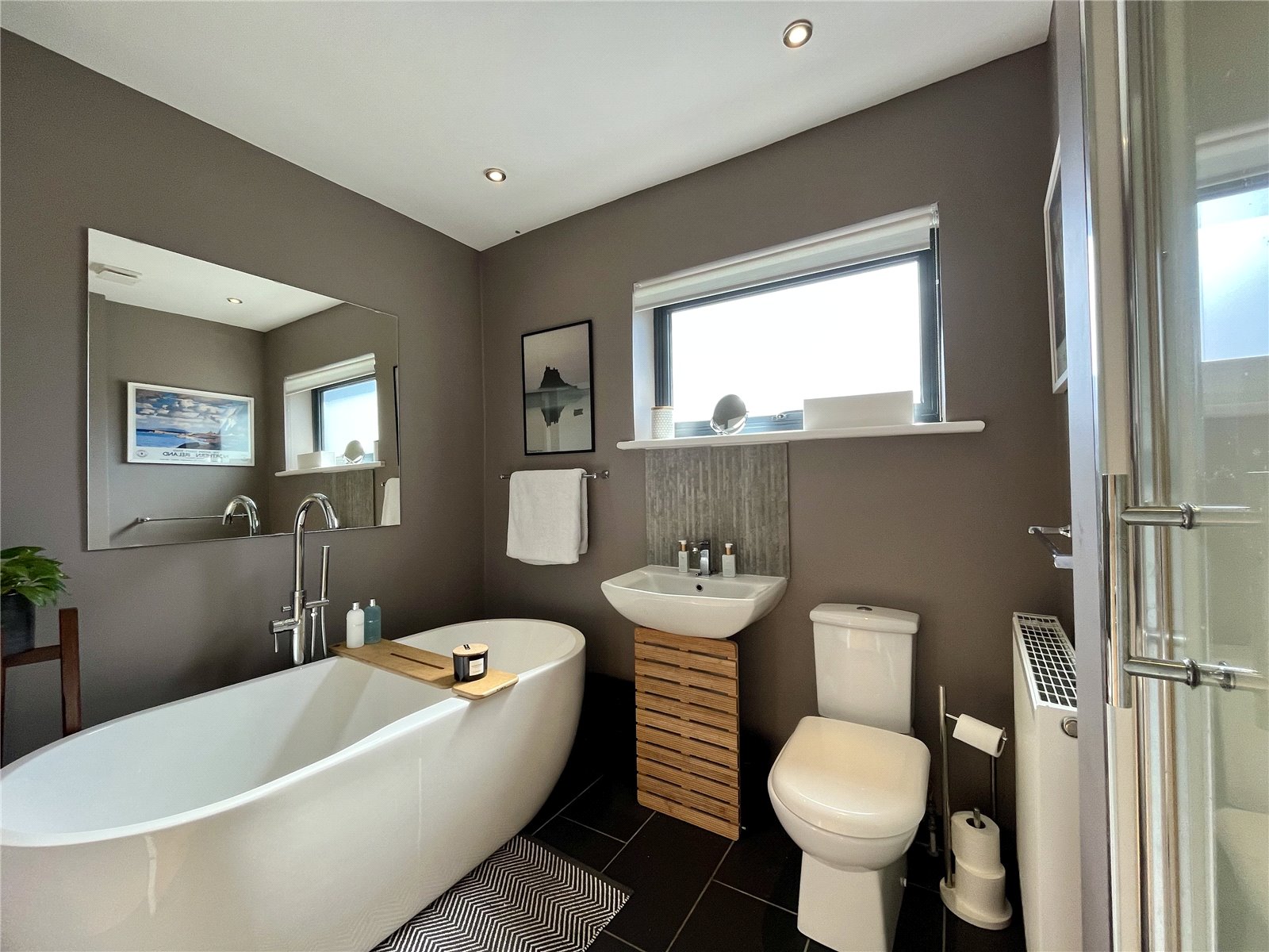 Freestanding 'egg' bath with mixer tap over, separate shower cubicle, wash hand basin, low level WC, ceramic tiled flooring and fitted cupboard.