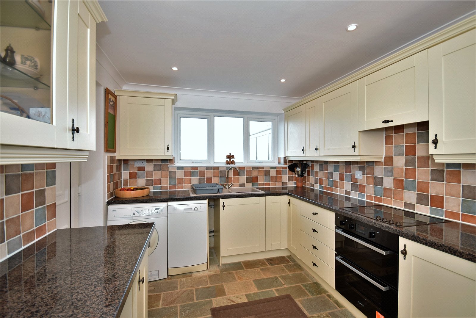 Fitted wall and floor units with worktops incorporating a four ring ceramic hob with double ovens under. One and a half sink unit with single drainer and mixer tap over, tiled splash backs, tiled flooring, plumbing for both dishwasher and washing machine. Door to outside.