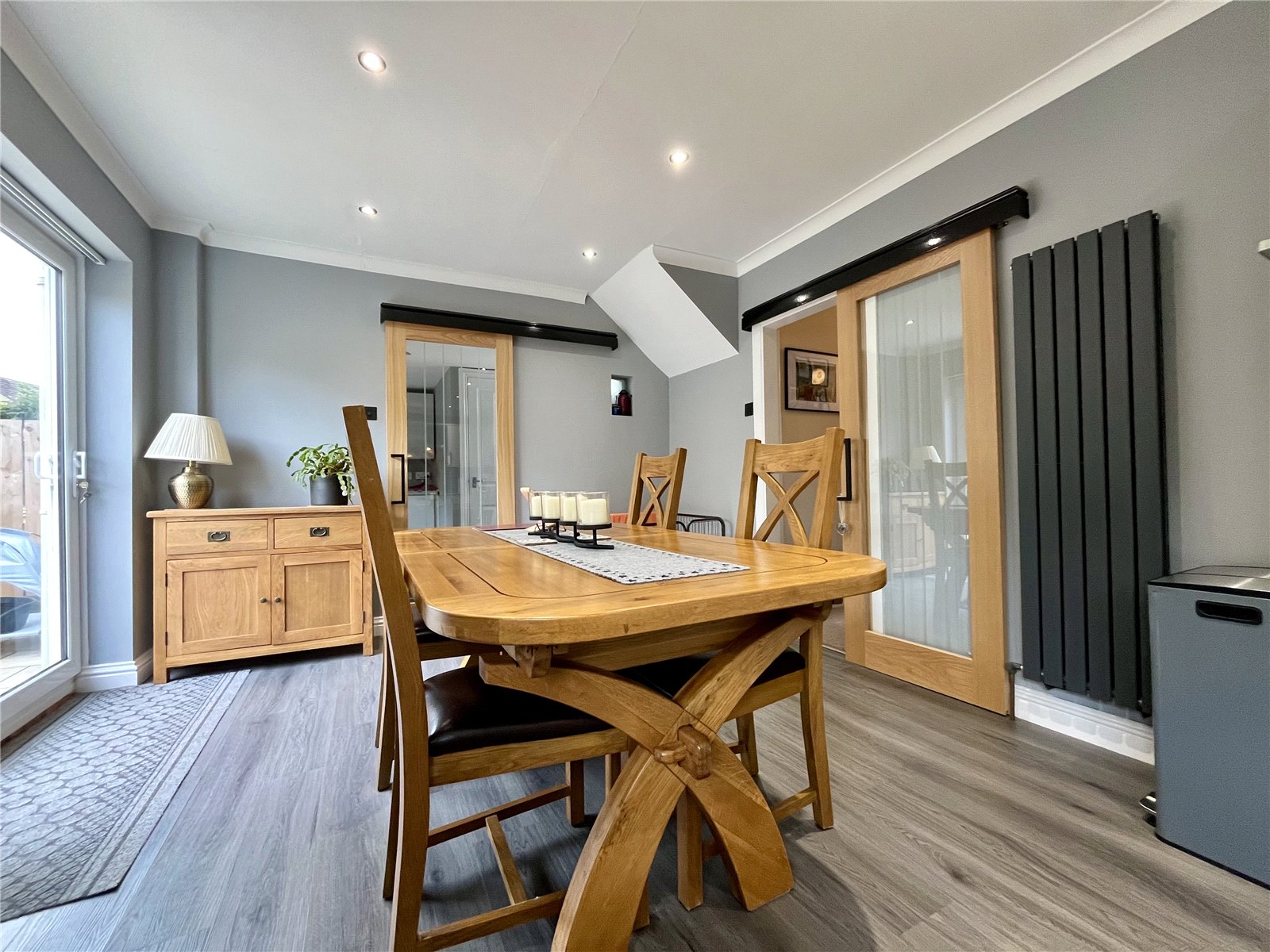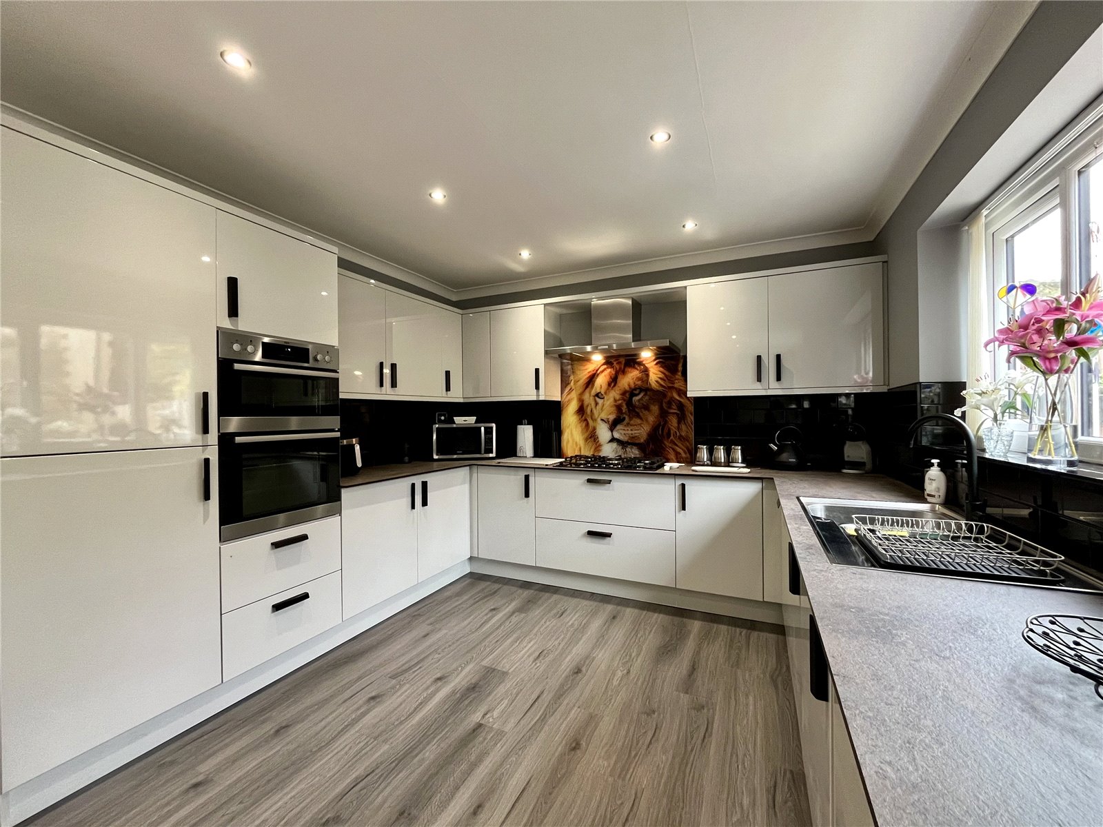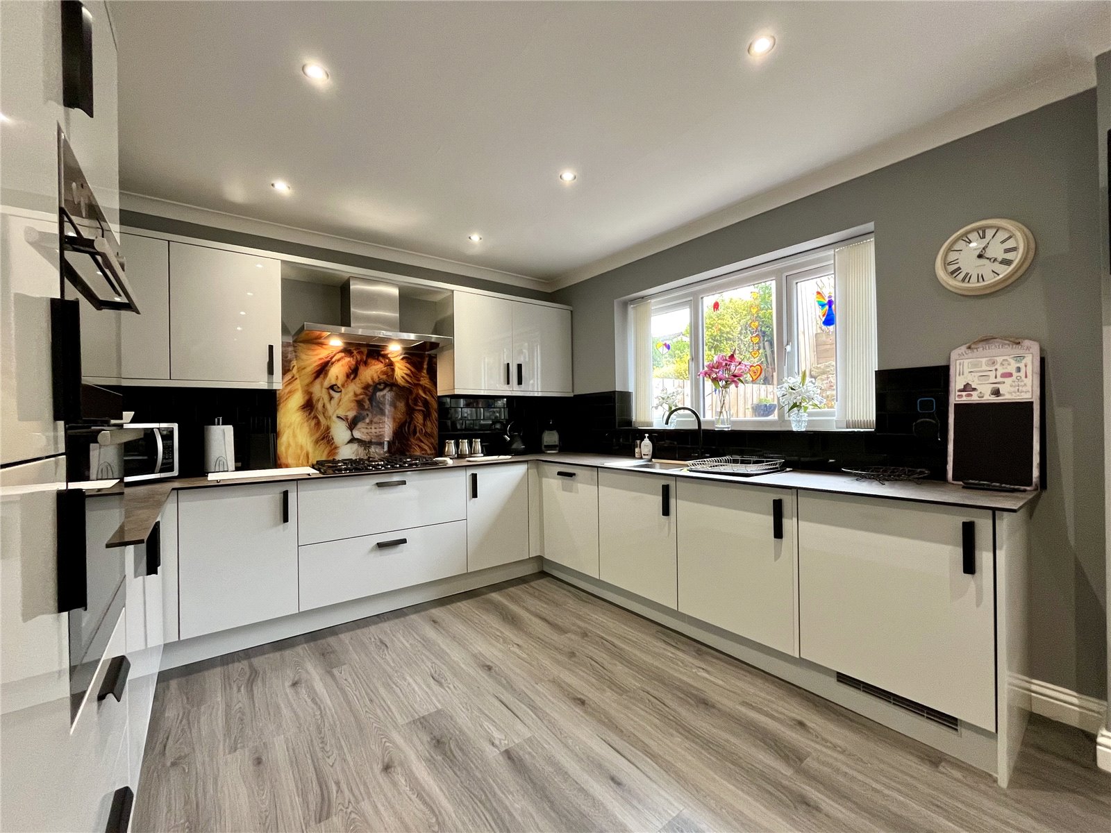A generous sized room, the kitchen end has fitted wall and floor cabinets in high gloss finish with worktops incorporating a one and a half stainless steel sink with single drainer and mixer tap over. Five gas hob cooker with stainless steel extractor canopy above, built-in double ovens and attractive tiled splash backs. Integrated fridge and freezer and dishwasher, all with matching fascias. The integrated washing machine and tumble dryer will be removed. Spacious dining area with sliding patio door to outside.