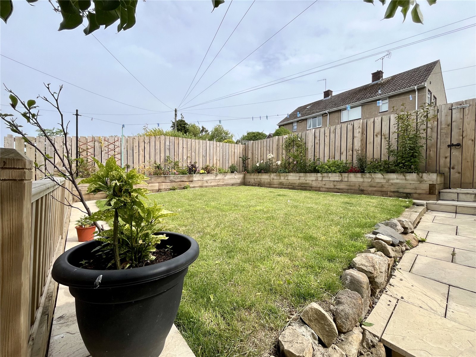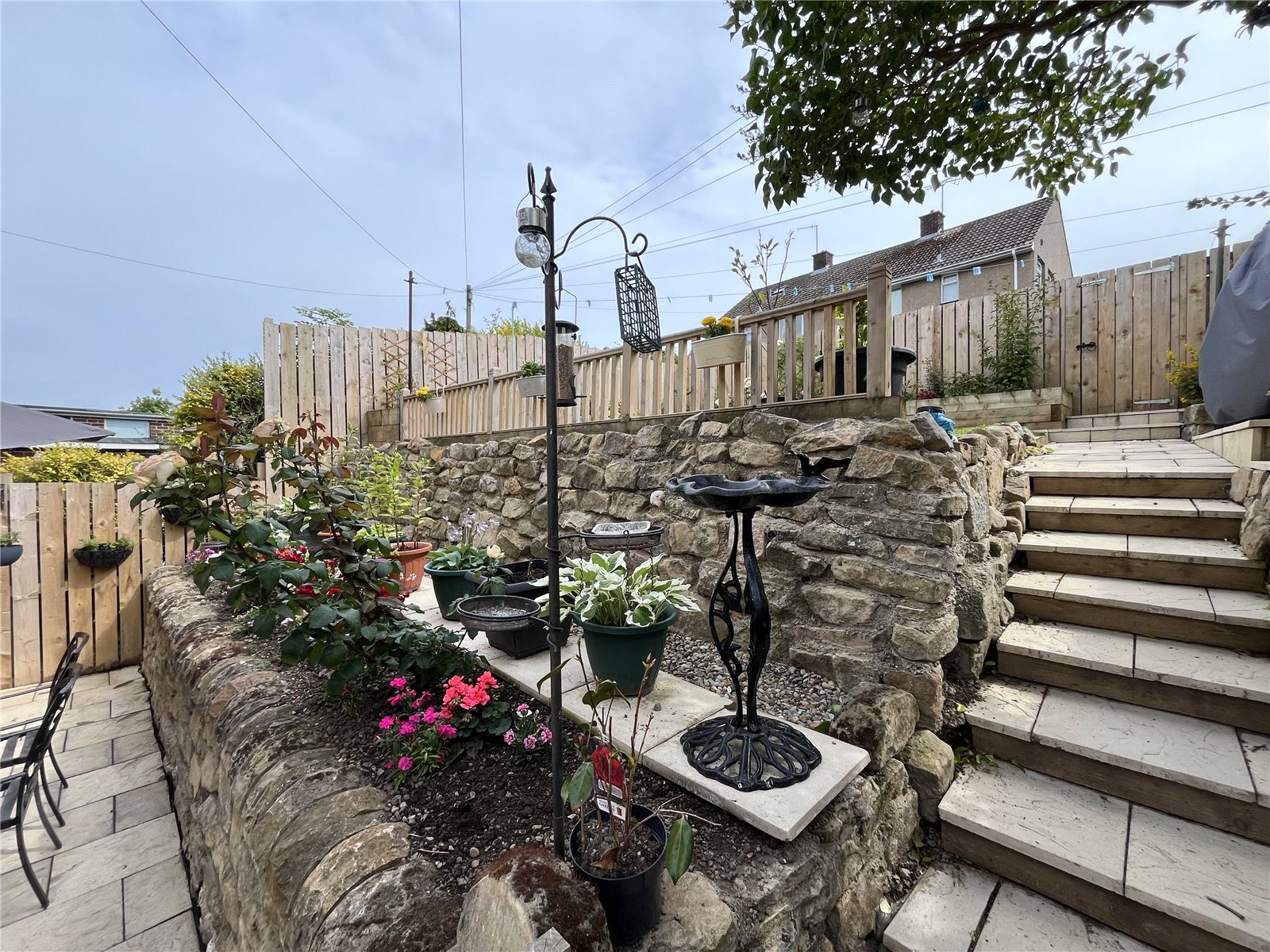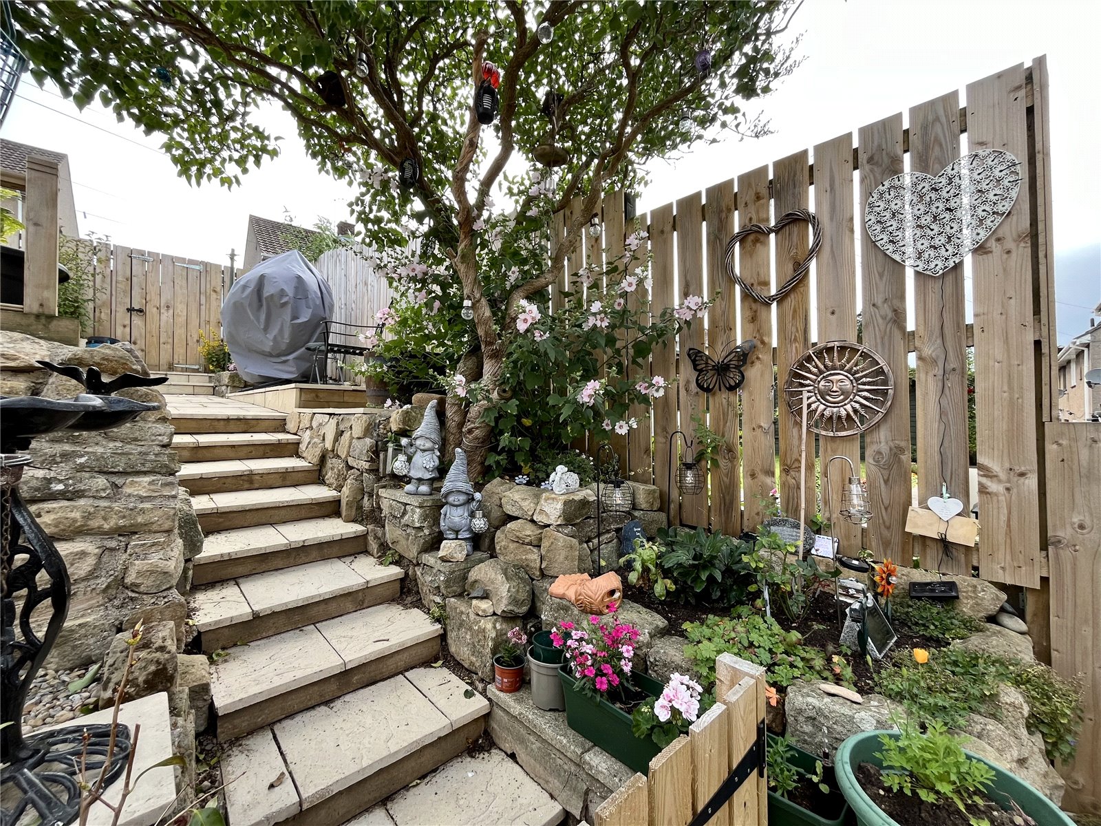 Is an enclosed terraced garden with a large paved patio area, with a southerly aspect, raised flower beds, bushes and shrubs, level lawned area with flower beds surrounded, all enclosed by high fencing. For very personal reasons most of the bushes and shrubs will be taken by the vendor. A shared pathway leads to a garage block with: