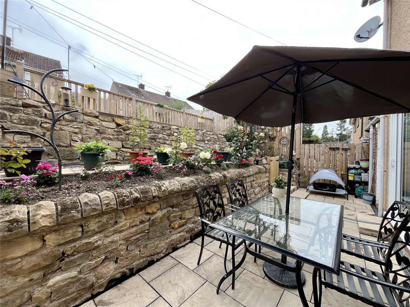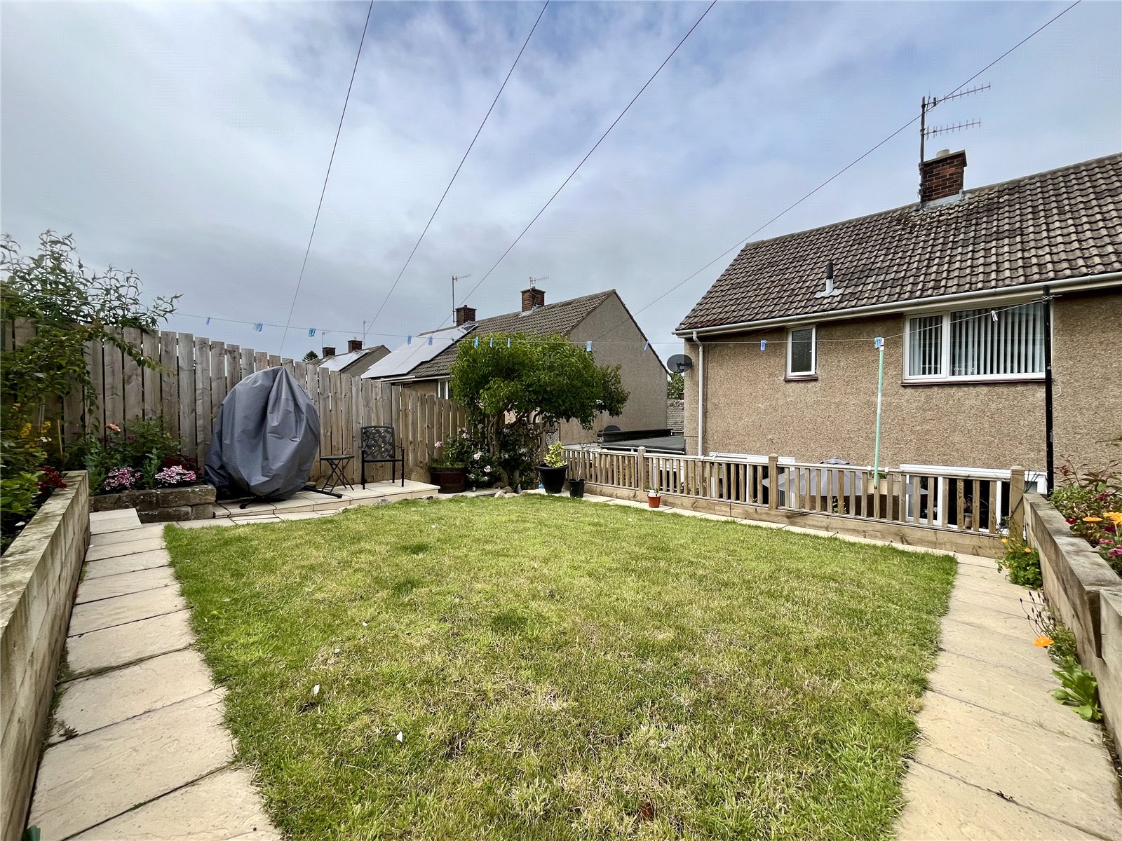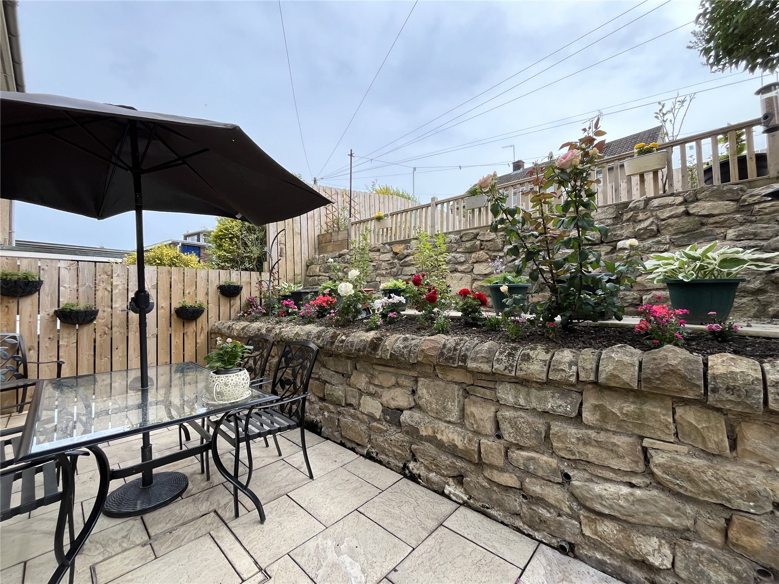 Is an enclosed terraced garden with a large paved patio area, with a southerly aspect, raised flower beds, bushes and shrubs, level lawned area with flower beds surrounded, all enclosed by high fencing. For very personal reasons most of the bushes and shrubs will be taken by the vendor. A shared pathway leads to a garage block with:
