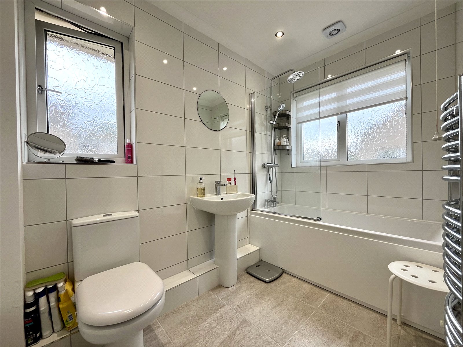 Panelled bath with shower over and glazed side panel, pedestal wash hand basin, low level WC, tiled splash backs and chrome heated towel rail.