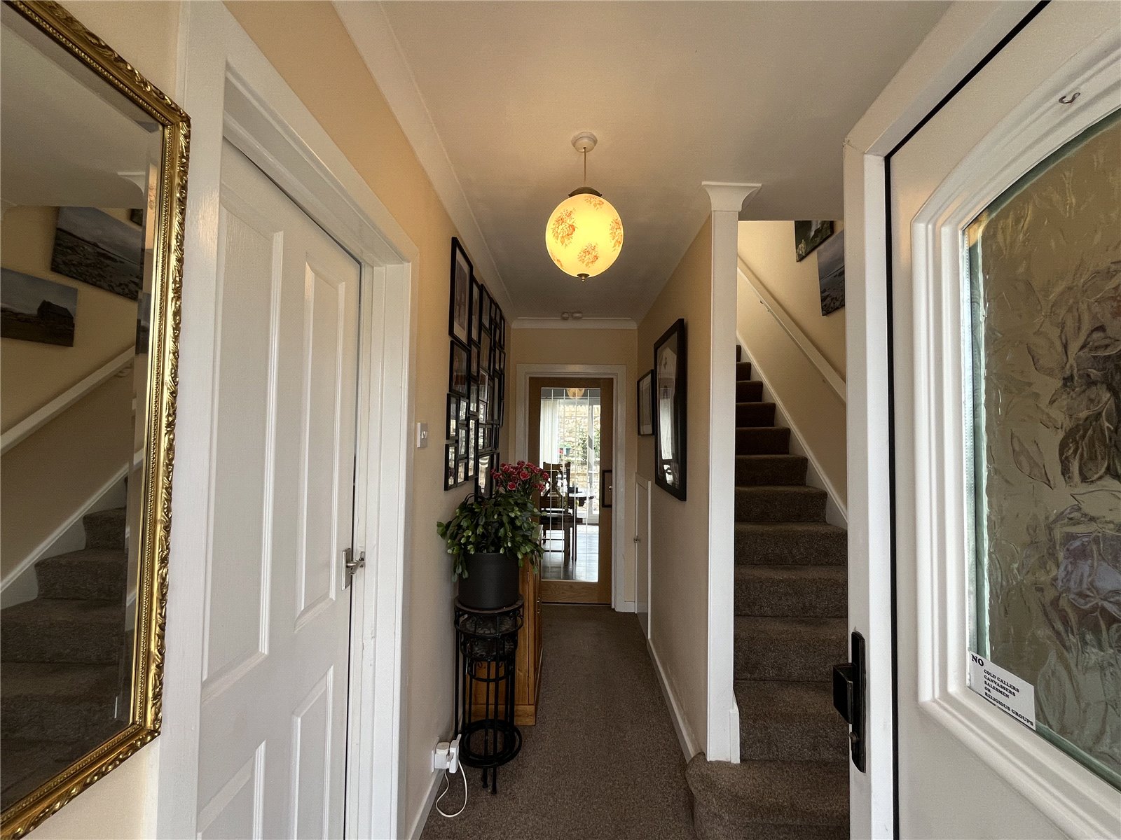 (measurement overall) uPVC front door with glazed inset and side panels. Cornice ceiling. Staircase to first floor with storage cupboard under.
