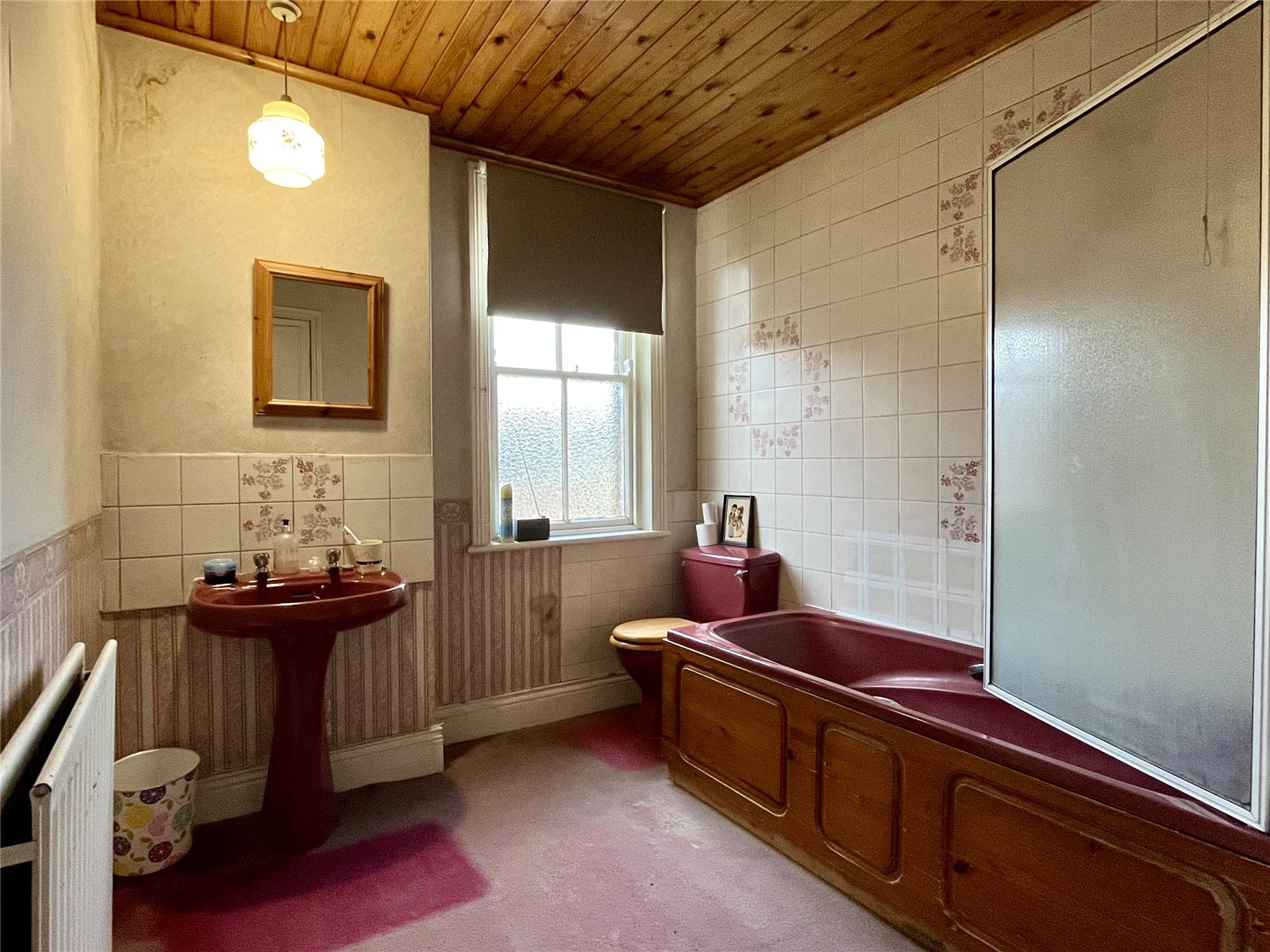 Panelled bath with shower over, wash hand basin, low level WC and tiled splash back.
