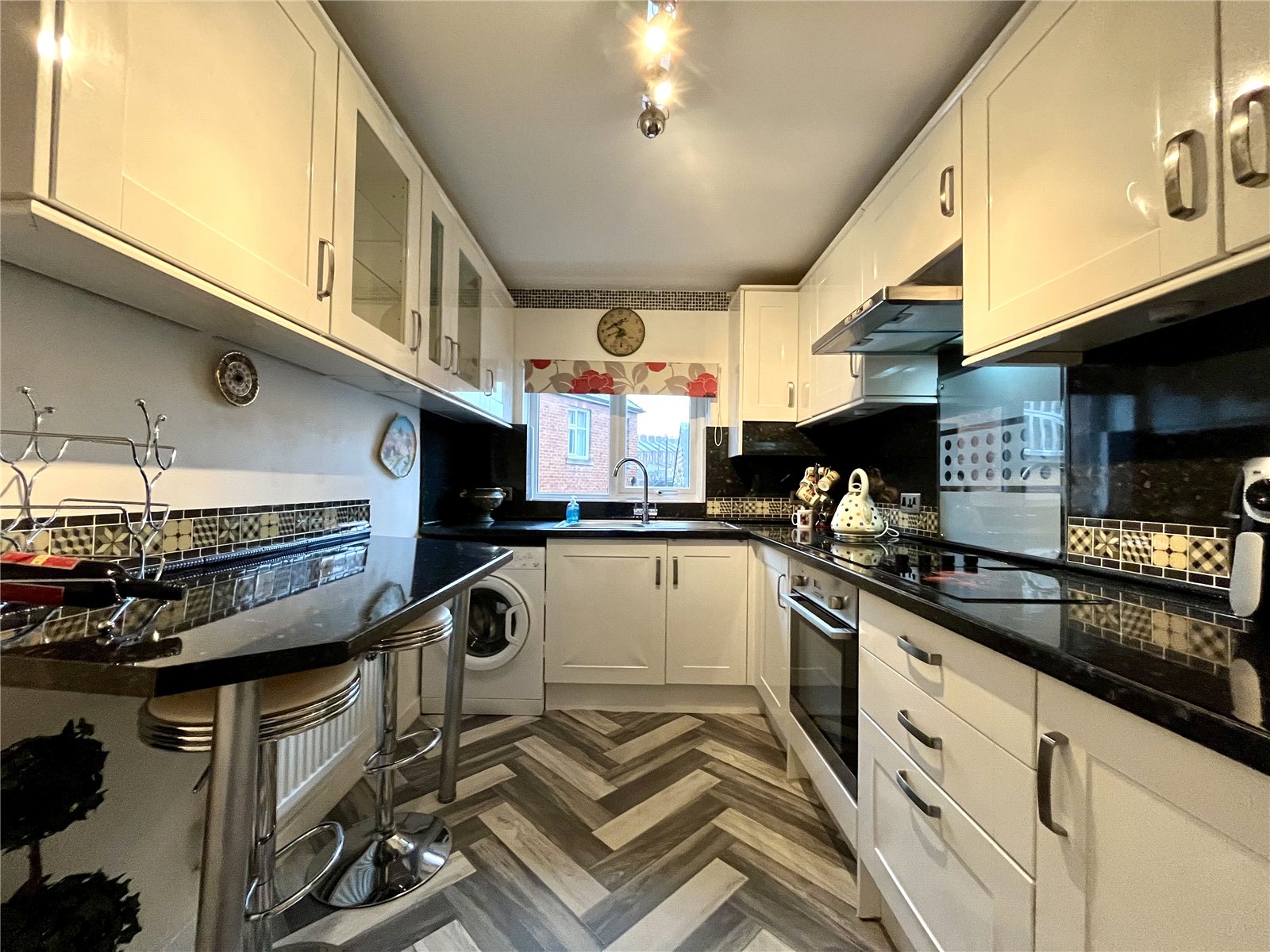 Ample fitted wall and floor units in high gloss white, black worktops over incorporating a stainless steel sink with single drainer and mixer tap over. Four ceramic hob cooker with single oven under and stainless steel extractor canopy over. Matching breakfasting bar. Plumbing for washing machine and space for fridge/freezer.