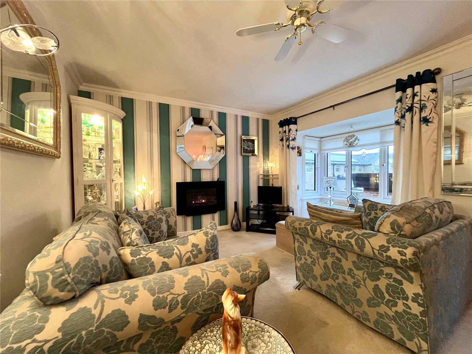 (measurement plus large square bay window) A well-appointed room with wall mounted contemporary fire, bay window and cornice ceiling.