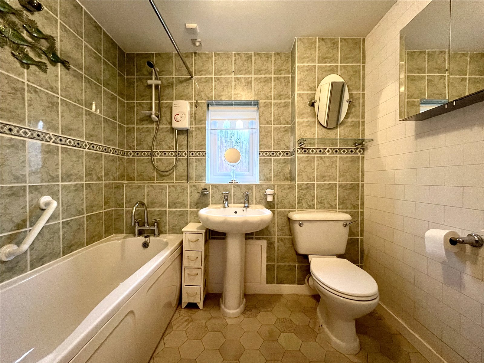White suite comprising panelled bath with electric shower over, plumbing for washing machine, low level WC and tiled splash backs.